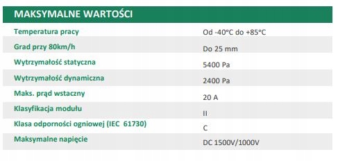 - Максимальная снеговая нагрузка 5400 Па, максимальная ветровая нагрузка 2400 Па