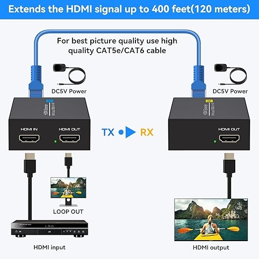 - 【Удлинитель HDMI 120M】 Этот удлинитель HDMI может расширить аудио и видеосигналы HDMI до 120 метров / 393 фута, используя один из анаэробных медных Cat6 / Cat7, поддерживая разрешение до 1080p@60 Hz. Передача стабильная, чистая и жидкая, без потерь и задержек. Это очень полезно, когда вы хотите просмотреть контент с обоих концов одновременно. (Примечание: если вы хотите расширить 120 метров, используйте с помощью CAT6 или более высокой спецификации с методом проводки 568B для Ethernet.) Он также ретроградный совместим с разрешениями, такими как 1080p при 60 Гц, 1080i при 60 Гц, 720p при 60 Гц, 576i@60 Гц и 480p при 60 Гц; Он поддерживает стратифицированный сжатый цифровой звук: PCM, поддерживает 8-битную глубину цвета, достигая лучшей аудио/видеопроизводительности. Это HDMI RJ45, который обеспечивает высочайшее качество впечатлений, удовлетворяющих потребности передачи на большие расстояния
