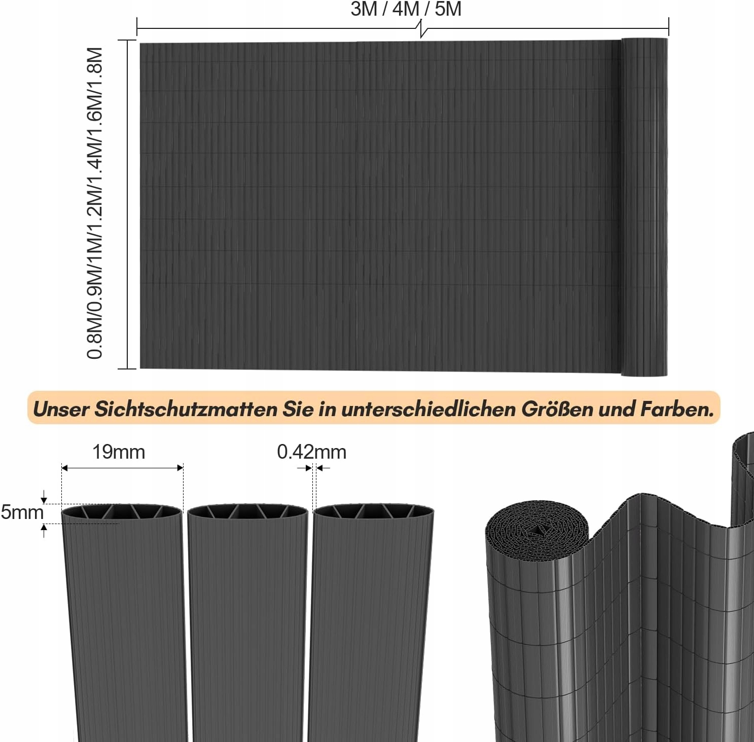 Наш камуфляжный чехол доступен в различных размерах и цветах, в 4 цветах: бамбуковый, коричневый, серый, зеленый. Высота от 0,8 до 1,8 м на выбор, длина от 3 до 10 м на выбор. Подходит для покрытия террасы, балкона или забора, а также как декоративный элемент в саду.