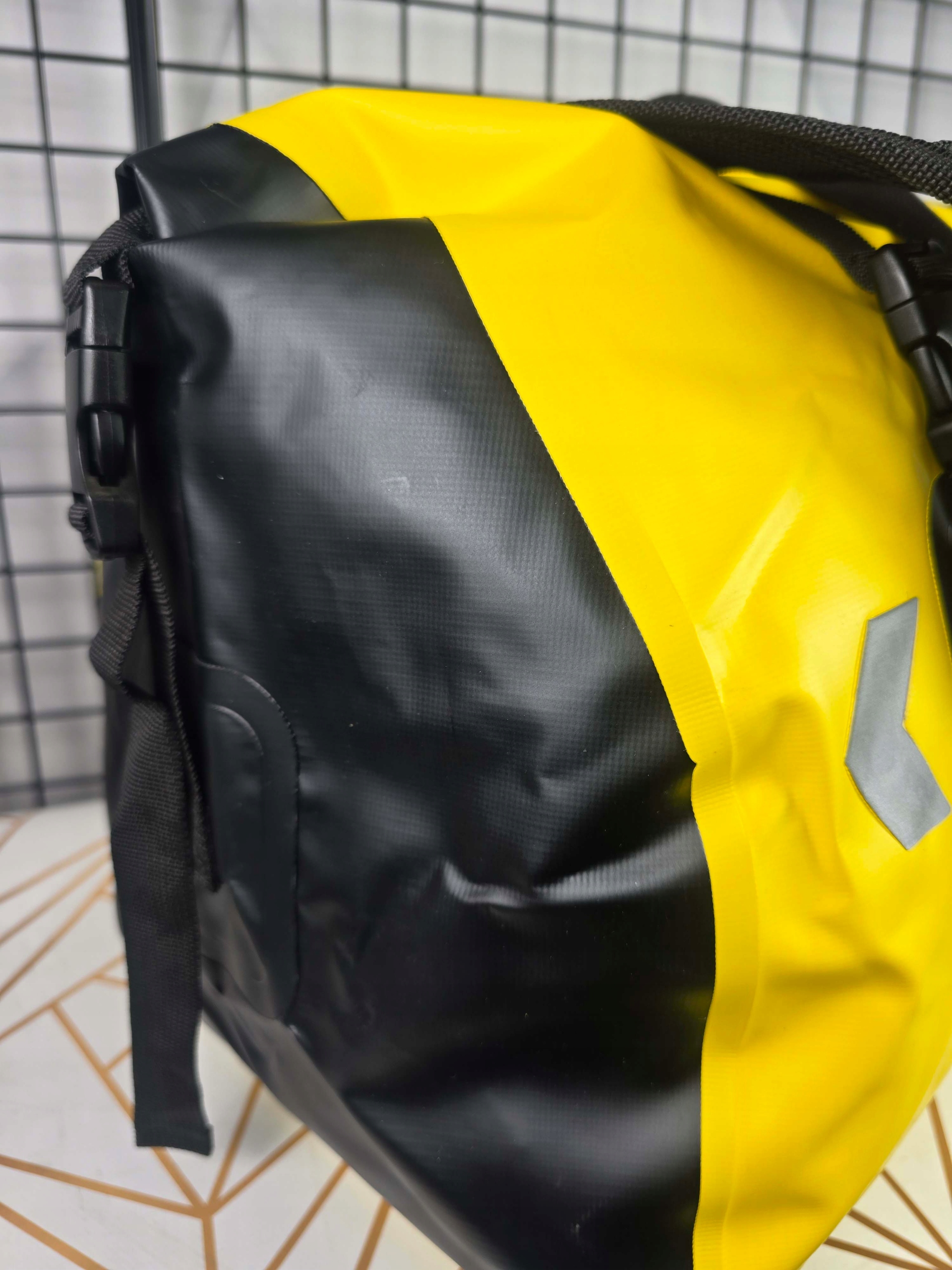 Водонепроницаемый багажный мешок из прочного материала из ПВХ с отражающими элементами, которые обеспечивают дополнительную безопасность на дороге. Он имеет регулируемые связи с регулируемым плечевым ремнем и вентиляционным клапаном.