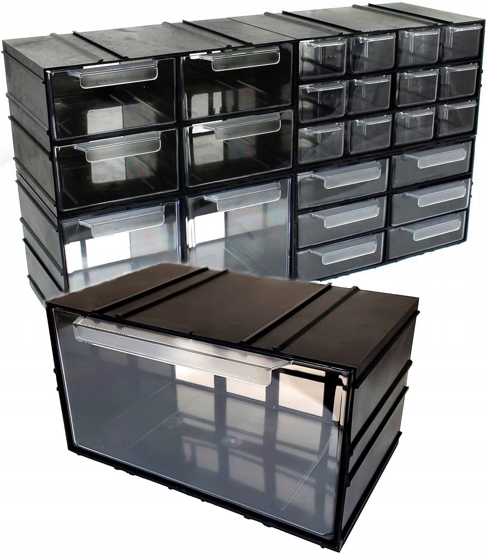 Модульная система выдвижных ящиков, позволяющая создавать комплекты или стены, состоящие из различных размеры ящиков. Корпус из полистирола имеет всегда одинаковый внешний размер. Система пазов позволяет соединять модули друг с другом. Внутреннее пространство разделено таким образом, что можно разместить один, два, четыре, шесть или двенадцать ящиков.