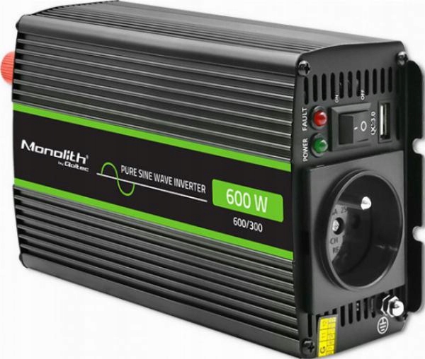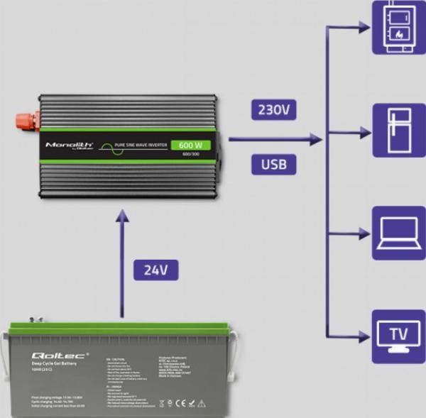 - Название продукта: Преобразователь напряжения Qoltec Monolith | 300 Вт | 600 Вт | от 24 В до 230 В | Чистый синус