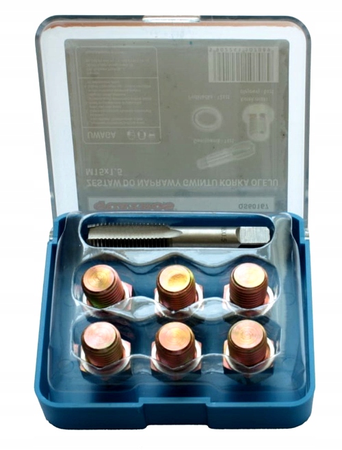 Набор инструментов, предназначенный для ремонта поврежденной резьбы масляной пробки размером М14х1,5. В комплекте: 1 шт – кран М15х1,5, 6 шт – пробка масляного поддона, 6 шт – шайба.