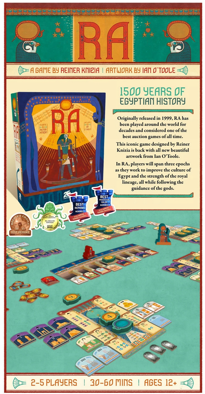 Ra — это игра с аукционом и коллекционированием наборов на древнеегипетскую тему. Каждый ход игроки могут покупать множество плиток с помощью своих ставок (солнц). После того, как игрок израсходовал свои солнца, другие игроки продолжают, пока не сделают то же самое, что может создать ситуацию, когда один неоспоримый игрок делает ставку на плитки до конца раунда. Напряжение нарастает, потому что раунд может закончиться до того, как все игроки получат шанс выиграть свои три лота за эпоху. Различные плитки либо дают немедленные очки, предотвращают отрицательные очки за отсутствие определенных типов в конце раунда (эпохи), либо дают очки после последнего раунда. Игра длится три «эпохи» (раунда). В игре легко освоиться.