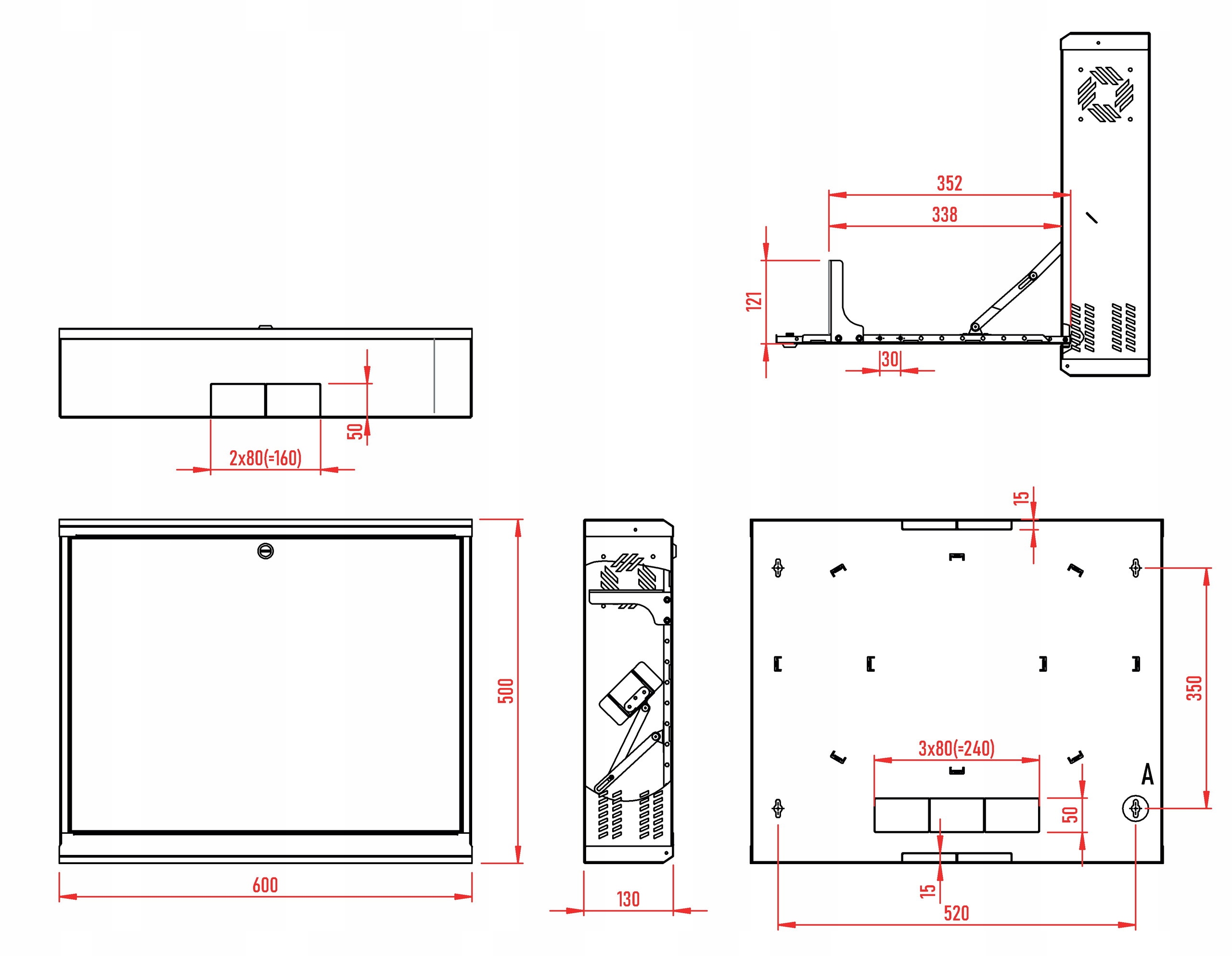 Используемые в шкафу приводы замедляют процесс открытия передней крышки, на которой расположены направляющие для монтажа устройств. Благодаря такому решению устройства, монтируемые в корпус не может подвергаться сильным ударам при открытии крышки.