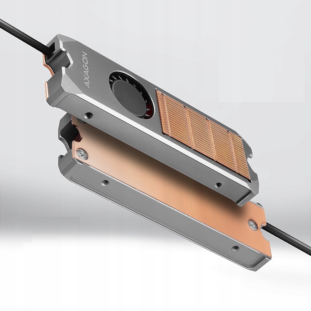 Медный радиатор AXAGON CLR-M2FAN с вентилятором для идеального охлаждения быстрых твердотельных накопителей M.2, особенно NVMe. Универсальный радиатор можно использовать для карт M.2 размерами 22 x 80 мм. Предусмотренные термопрокладки обеспечивают улучшенное охлаждение всех односторонних и двусторонних твердотельных накопителей M.2.