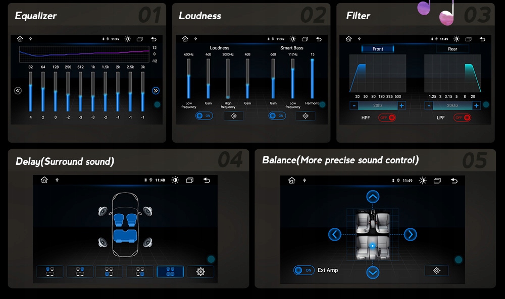 - Цифровой звуковой процессор и графический эквалайзер ( EQ) обеспечивают качественный звук, который удовлетворит даже самых требовательных меломанов! Имеется несколько встроенных режимов, определяемых эквалайзером (Rock, Pop, Jazz и т. д.), и пользователь может свободно их настраивать. Имеет функцию ГРОМКОСТЬ. Радио также имеет опцию ФЕЙДЕР, которая позволяет нам изменять пропорции звука между отдельными динамиками.