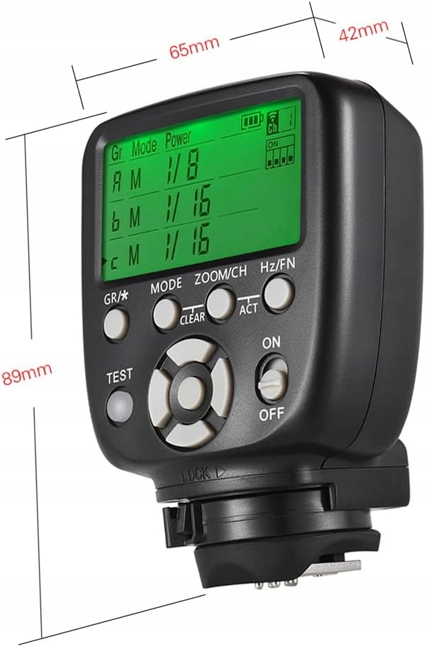 👉 Контроль управления был взят из ламп из серии YN560 III/IV. Кнопки хорошо описаны и интуитивно расположены. Работа с устройством не является серьезной проблемой, даже для любителей фотографии начинающих. На обратной стороне передатчика есть электроэнергия, размещающая две батареи AA. Триггер оснащен нижним нижним колонтитулом (мульти интерфейс) с быстрым блокировкой. Передатчик работает в двух вспышках M и Multi (стробоп) режима. Непосредственно с уровня триггера вы можете управлять настройкой мощности и увеличением горелки лампы