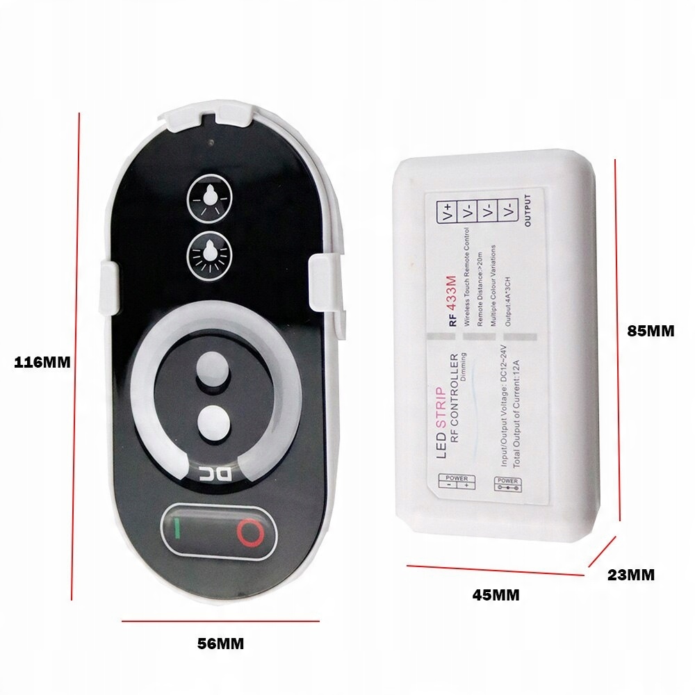Беспроводной радиоконтроллер для моно светодиода полоски с современным дистанционным управлением по сенсорной технологии. Перемещение пальца по шкале вызывает плавное изменение интенсивности освещения. Благодаря связи между пультом и контроллером посредством радиоволн нет необходимости направлять пульт на диммер.