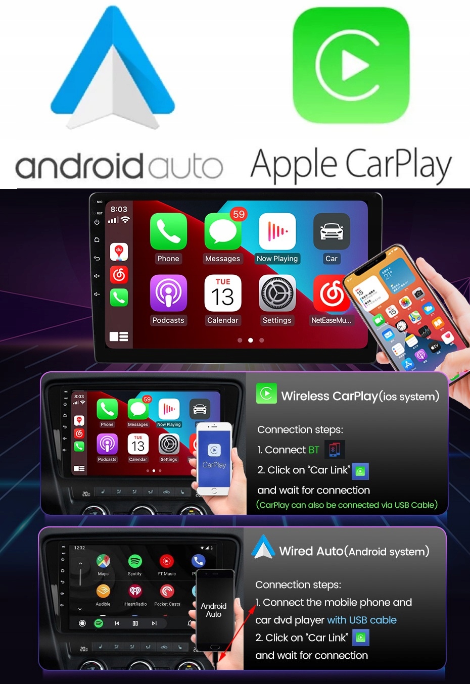 Устройство поддерживает Android Auto и Apple CarPlay