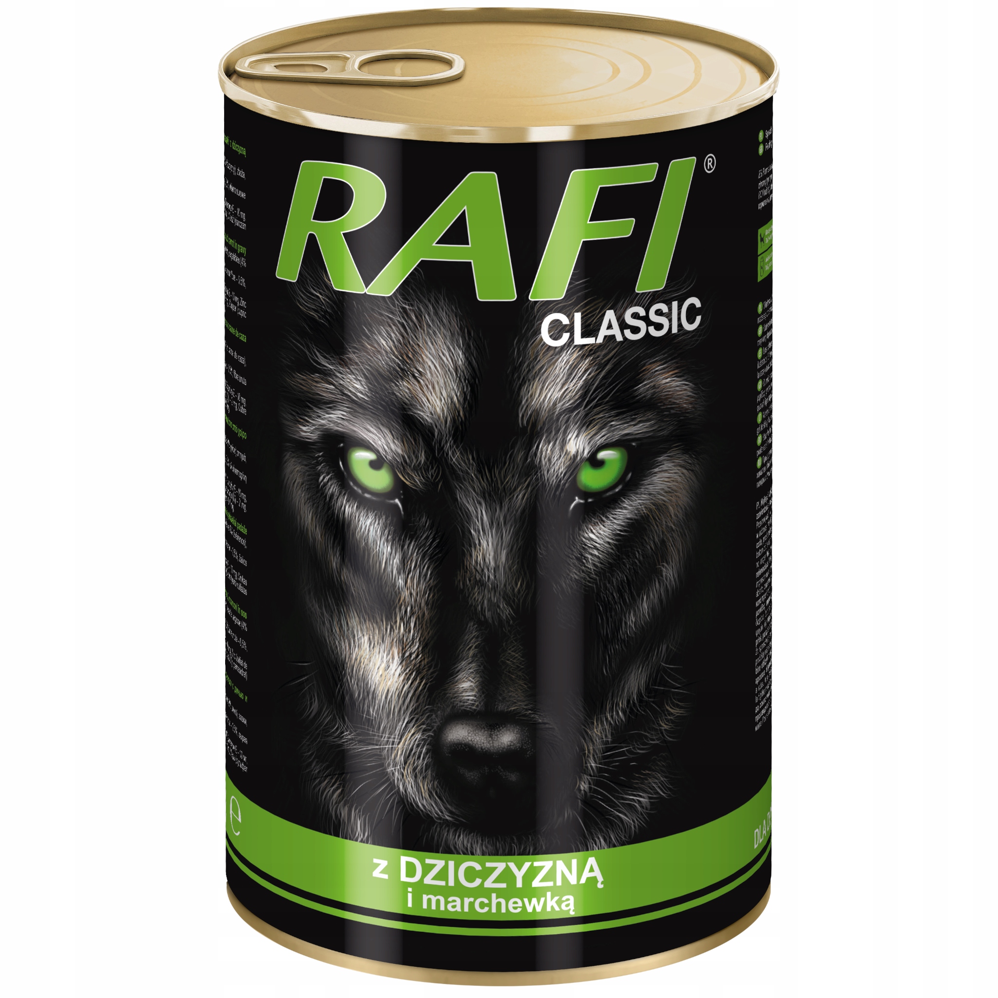 ИНГРЕДИЕНТЫ RAFI CLASSIC FOOD С ДИЧЬЮ И МОРКОВЬЮ: мясо и продукты животного происхождения 65% в кусках (в том числе 8% дичь), крупы, овощи (4% морковь), минеральные вещества, сахара