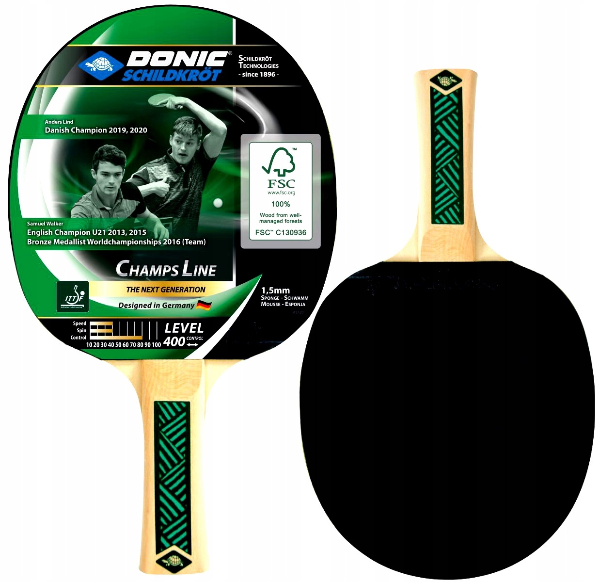 ✨РАКЕТКА ДЛЯ НАСТОЛЬНОГО ТЕННИСА DONIC CHAMPS LINE 400 FSC! изготовлена из 5-слойной фанеры, сертифицированной FSC, и покрытия Schildkröt Jade, одобренного ITTF, что удовлетворит каждого начинающего игрока.✨
