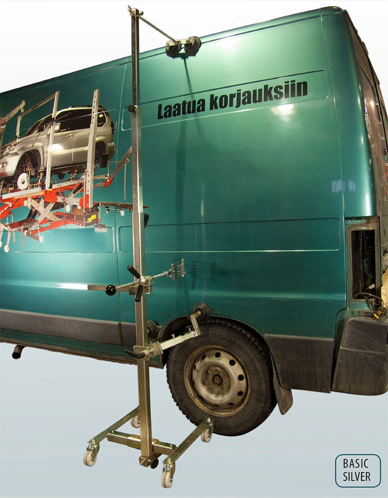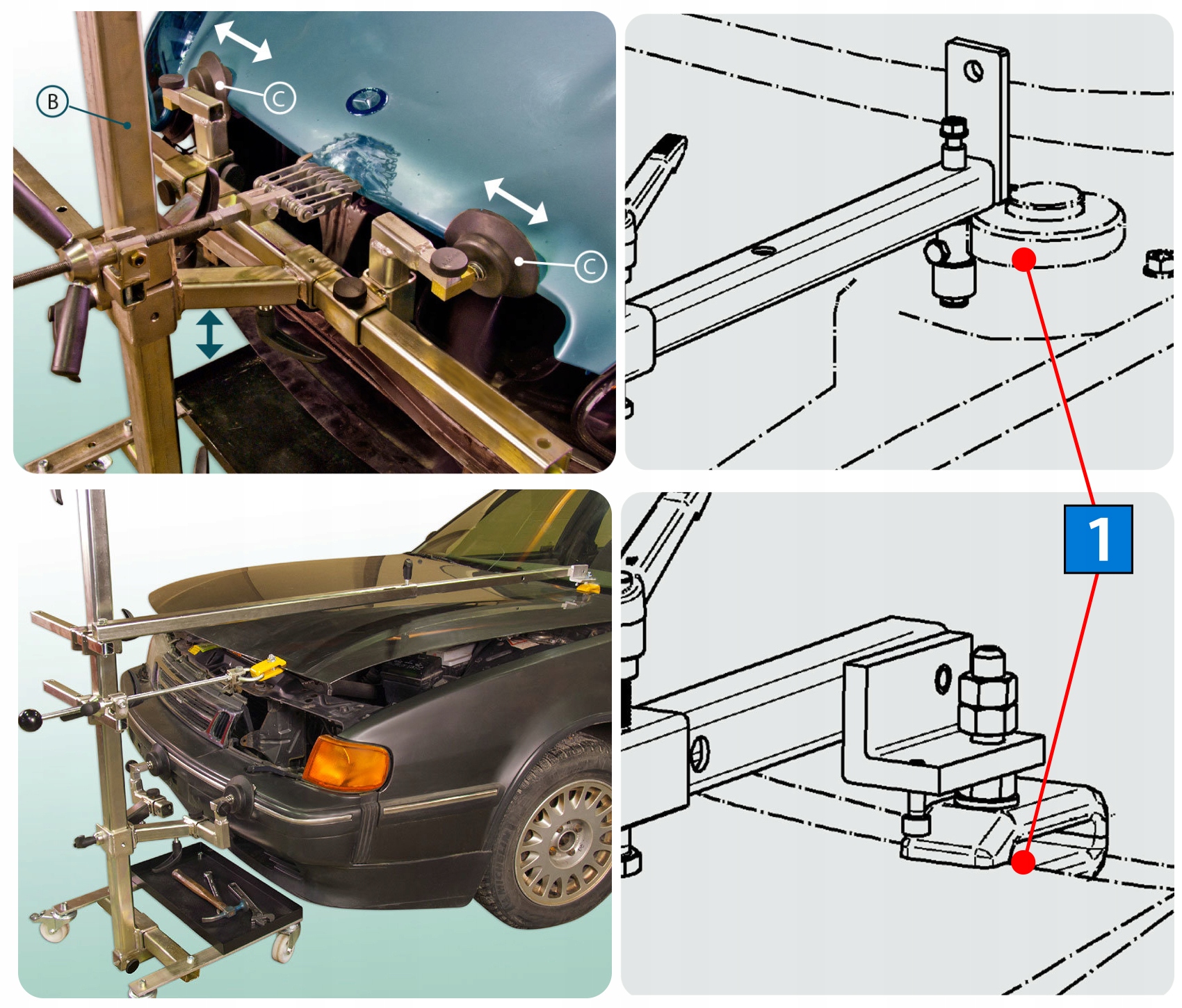 - ✔️ Быстрое выпрямление бокового корпуса (и не только) вблизи места ремонта, это Основой является вертикальная балка, оснащенная передвижной тележкой с регулируемыми резиновыми кронштейнами, поддерживаемыми усиленными элементами кузова. Затем вмятину извлекают с помощью винта, направленного в зону ремонта.