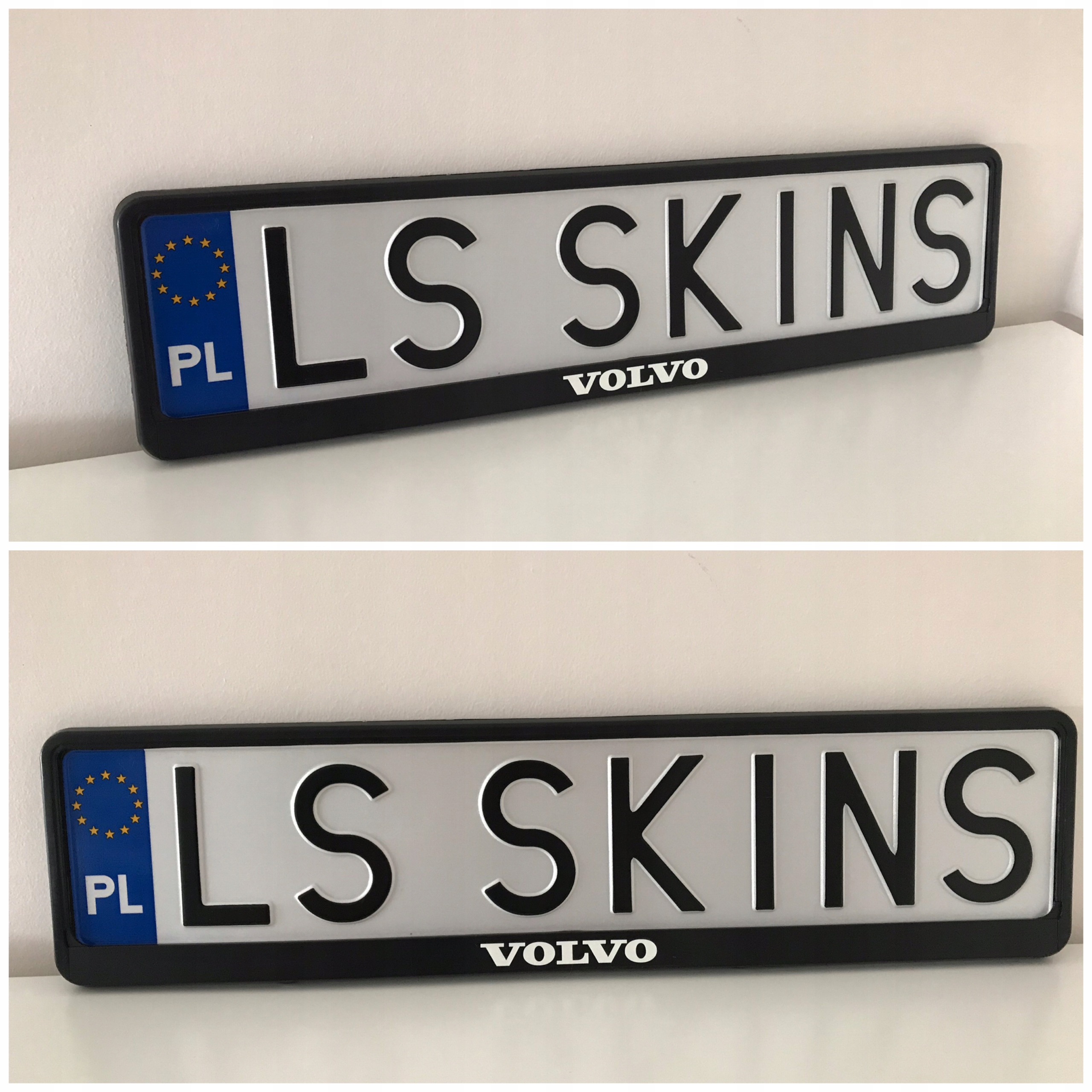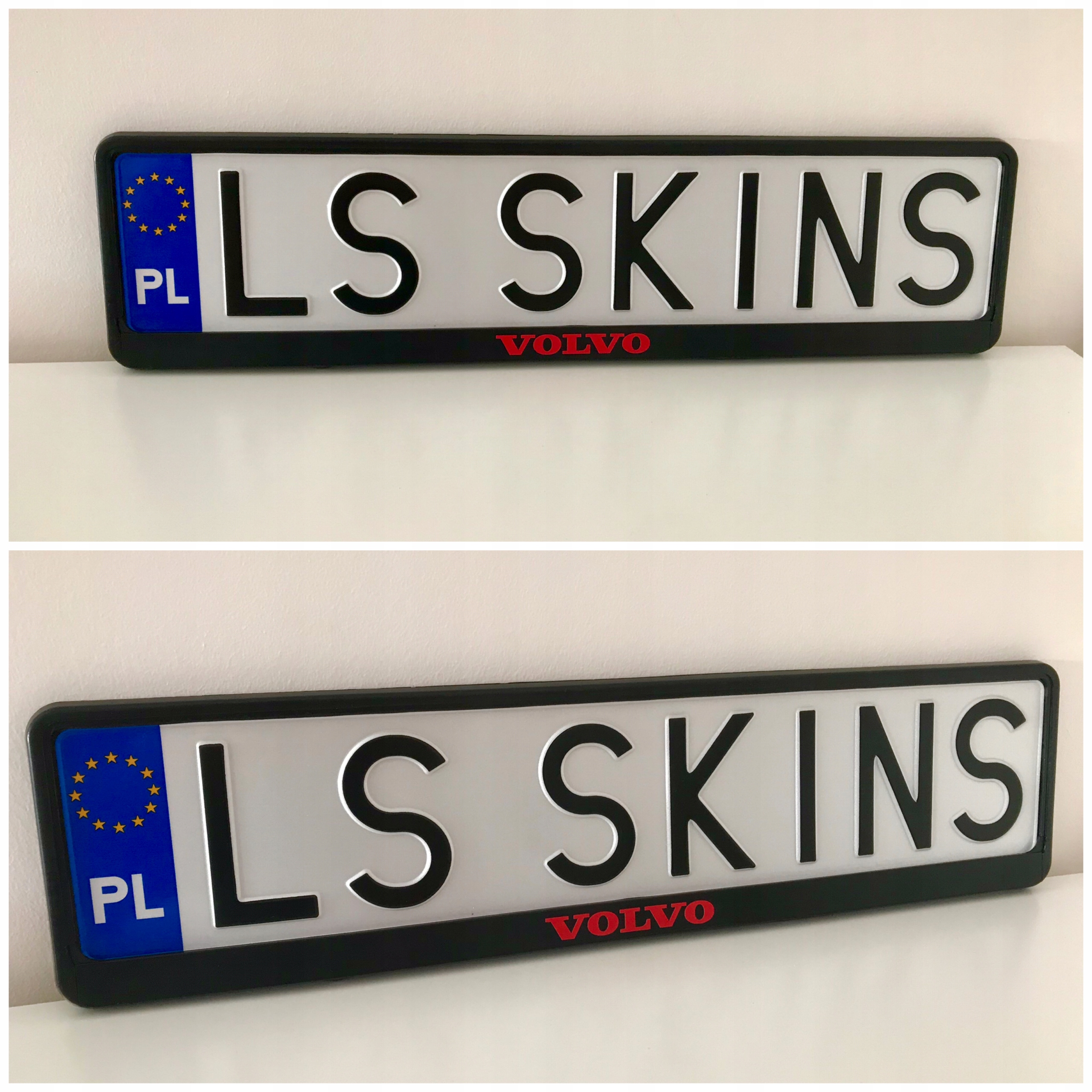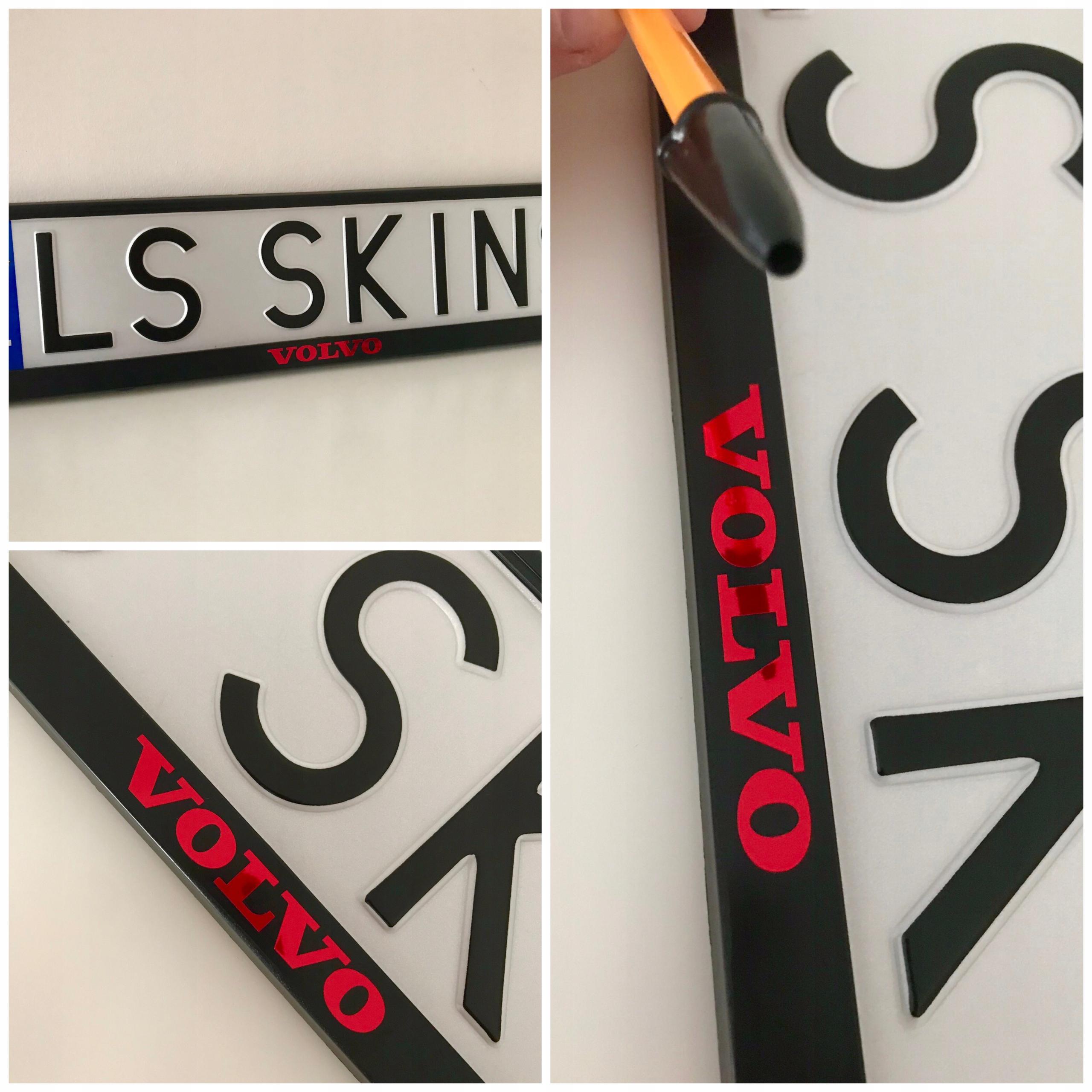 На аукционе выставлена черная рамка номерного знака ЕС с надписью Volvo в различных цветах.