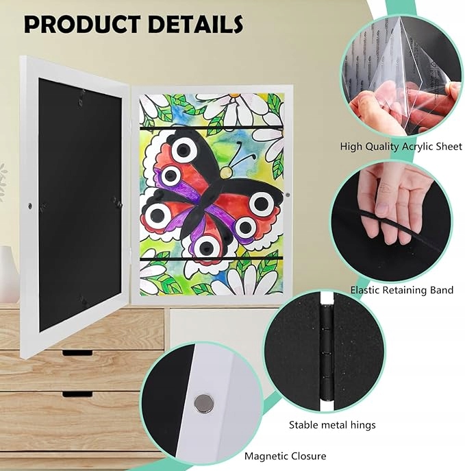- 1. Многофункциональность: благодаря современному дизайну вы можете оптимально представить произведения искусства и фотографии, потому что передняя сторона рамы сделана из прозрачного, устойчивого к царапинам акрила. Фоторадки для детей доставляются с двумя вешалками для одежды и вертикальной и горизонтальной подвесной подвеской. Легкий в использовании: простой в использовании фоторамку для заполнения, оснащенная магнитной входной дверью для легкого доступа и безопасного удержания. Магнитные двери идеально подходят для домов с многими детьми, потому что их можно легко растянуть, положить внутрь, близко и готовые. Высокая емкость: внешние размеры детских фоторадров составляют 24,5 см х 33 см, а внутренние размеры 21 см х 30 см. Эти рисунки для детей имеют большую вместимость и содержат 100 листов обычной бумаги A4, соответствующей бумаге A4 или меньшей бумаге. Очень большая емкость и две гибкие кожаные полосы поддерживают произведение искусства на месте, не повреждая его. Набор включает в себя: 4 -х складные фотораторы для детей, в том числе не -фирмированные гвозди для подвески (фоторамка с двумя гвоздями), 20 листов бумаги рисования в A4. Подарок: подходит как день рождения, подоконник или рождественский подарок для детей, родственников и друзей. Ваши дети будут очень гордиться тем, что поделились своими произведениями искусства с семьей и друзьями