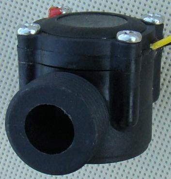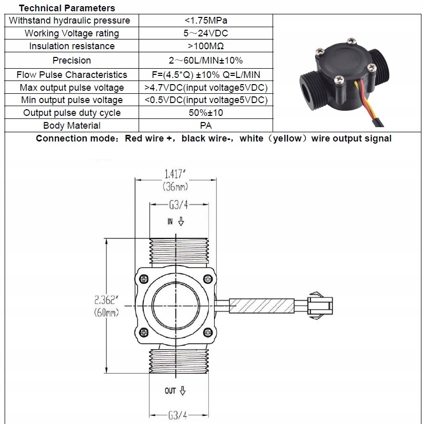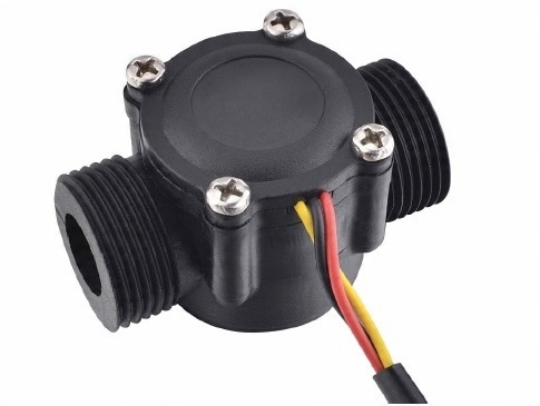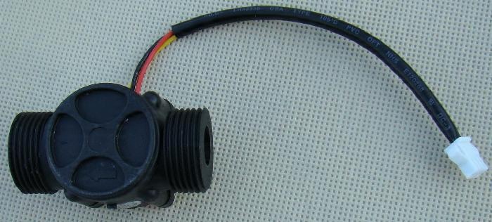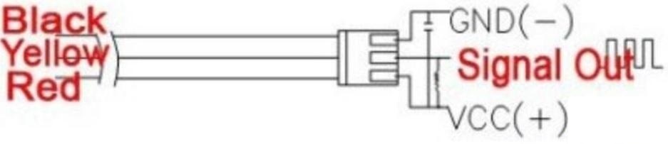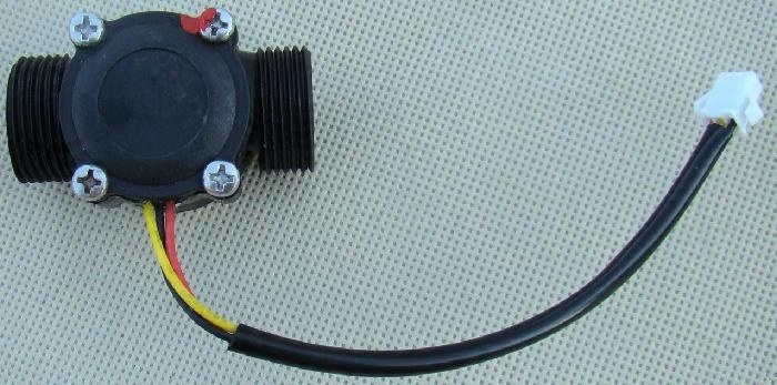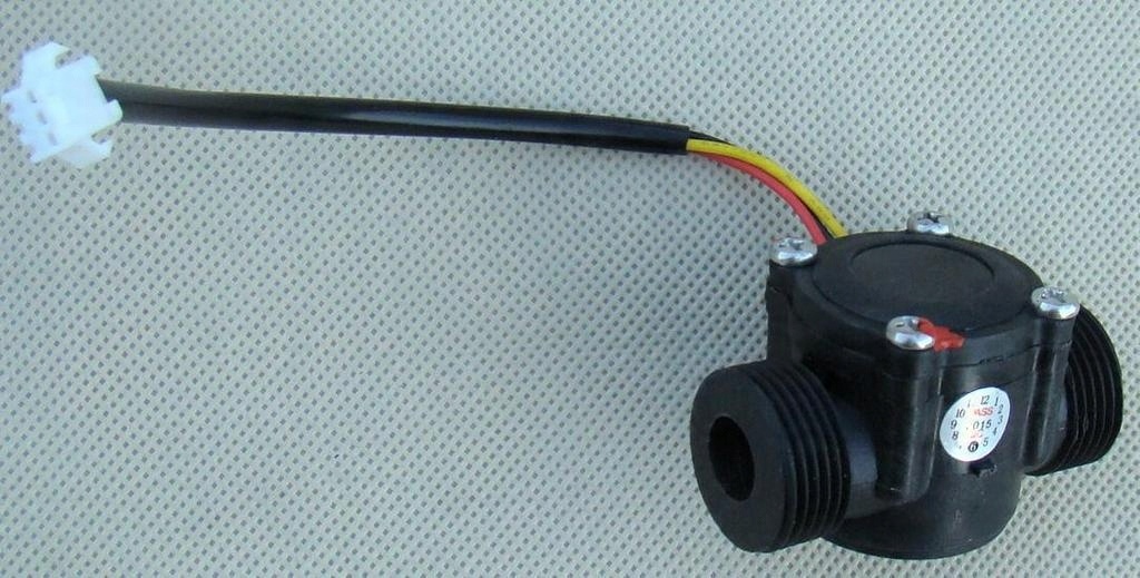 Расходомер имеет три провода: черный — минус источника питания, красный — плюс питания, желтый провод — сигнальный провод