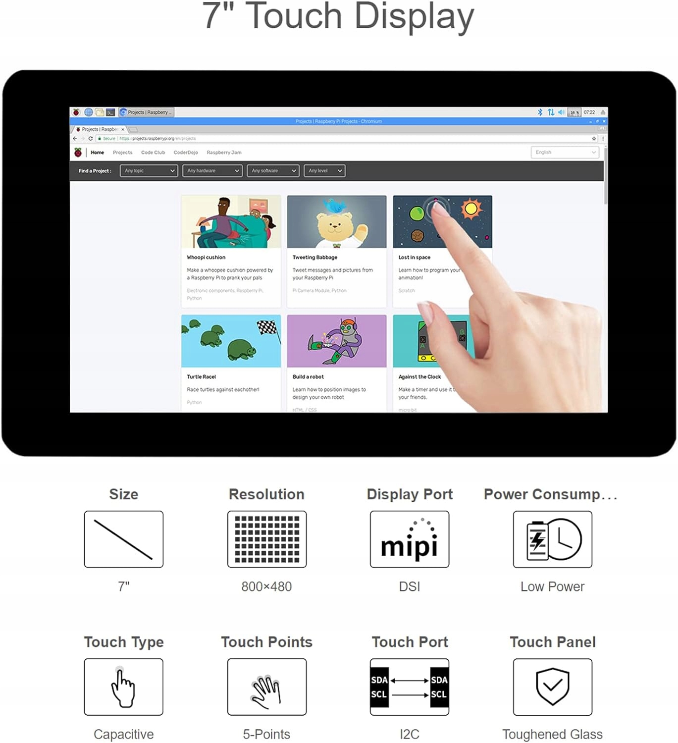 Raspberry 7" TFT РК-дисплей, сенсорний екран для Pi 4B/3B+/3A+/3B/2B/B+/A