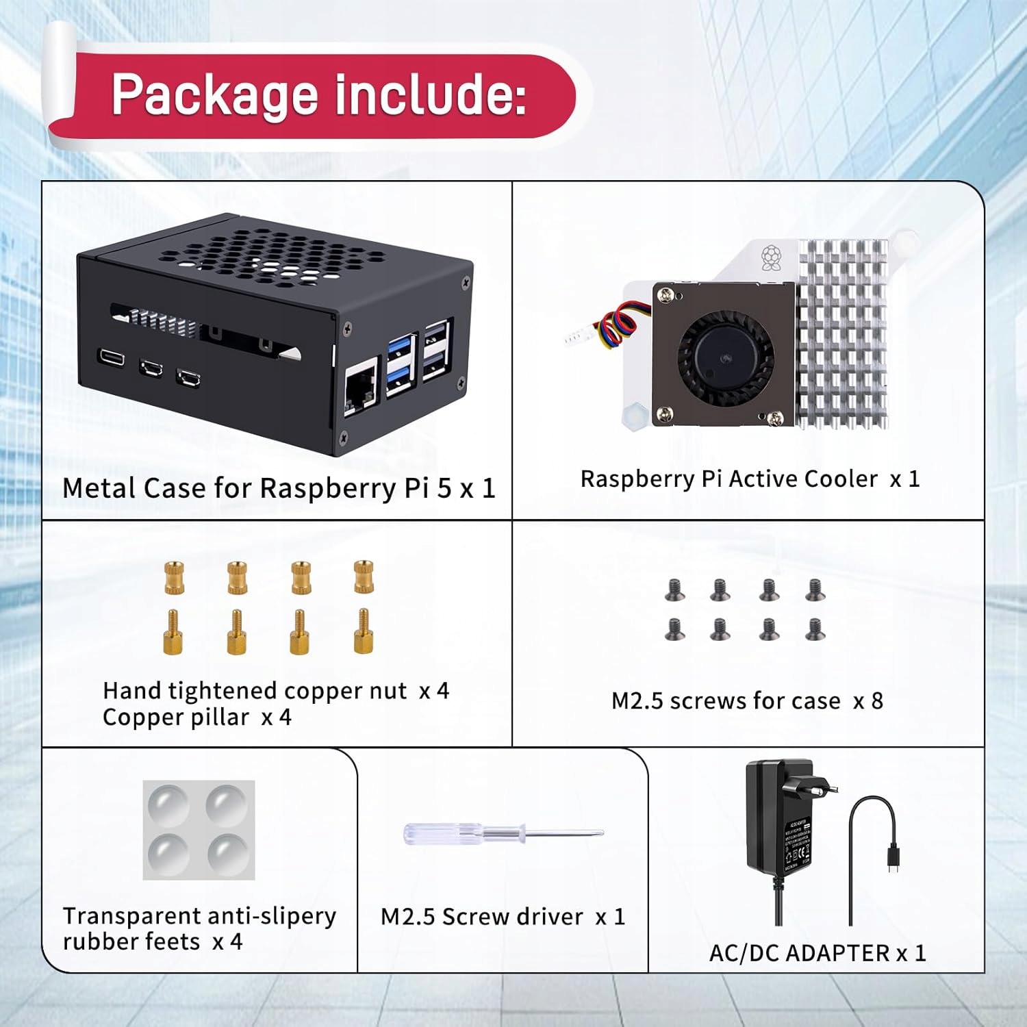 - Пакет содержит. 1x металлический корпус для Raspberry Pi 5, 1x Официальный активный охладитель Raspberry Pi 5; 1x27 Вт для Raspberry Pi 5; 1x набор винтов, 1x4 ПК. 1x отвертка. Не включает Raspberry Pi 5, M.2 NVME SSD, M.2 NVME SSD