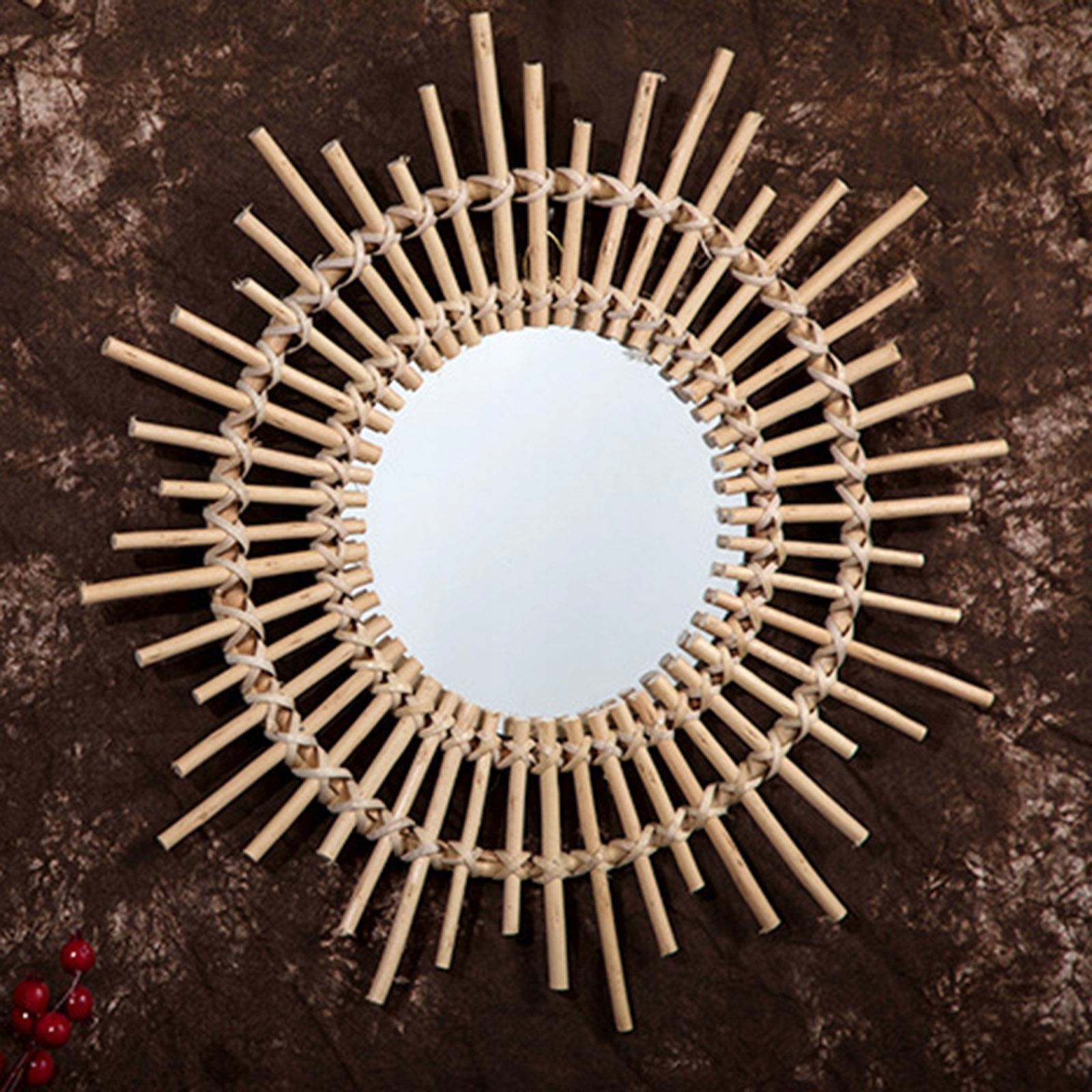 Плетеное плетеное зеркало, висящее на стене, тонкий и деревенский дизайн, обеспечивающий как утилитарные, так и декоративные элементы.