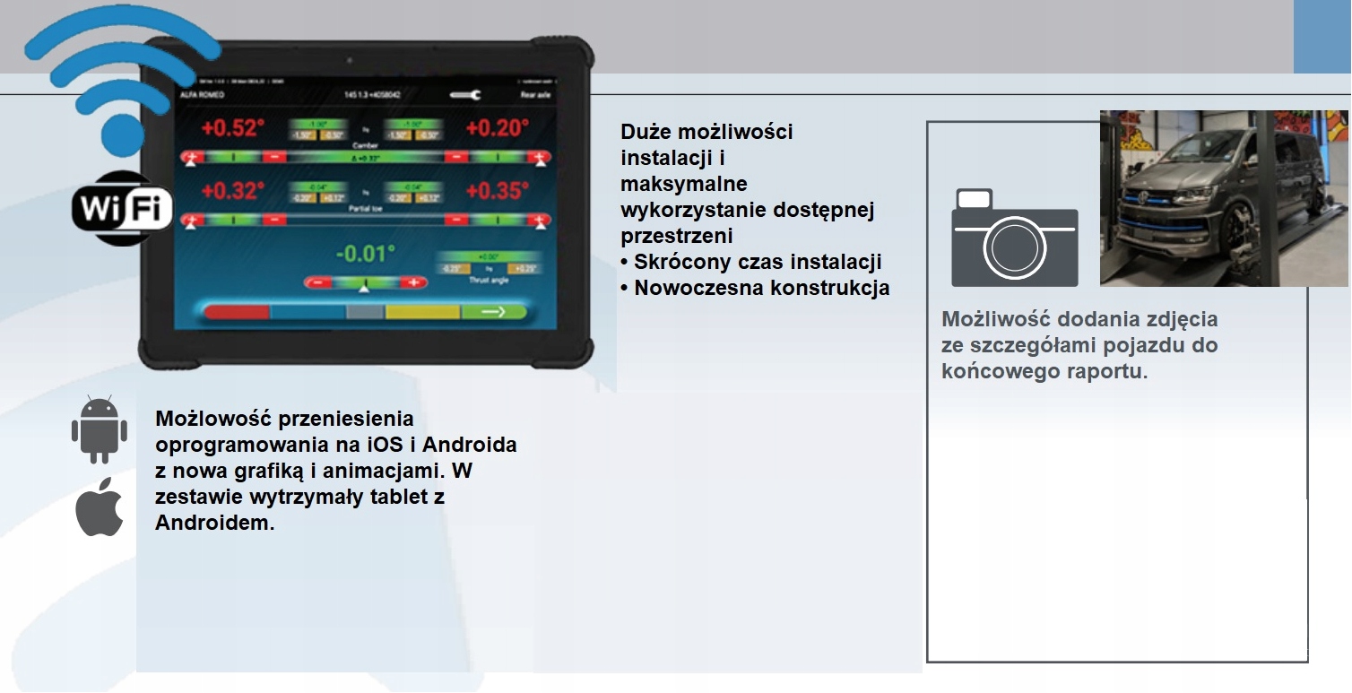 Революционное и инновационное устройство для регулировки сход-развала теперь доступно!! Новая концепция от итальянского производителя Ravaglioli для регулировки сход-развала с 8 датчиками. Полностью без ПК, его можно использовать в среде Wi-Fi с планшетом. Компактная, технологичная альтернатива существующим на рынке решениям. Нет шкафа с управляющим компьютером. Полная модернизация измерительной головки с подшипниками для быстрой компенсации и одним энкодером (решение от самых высоких моделей) Инновационная концепция хранения измерительных головок и зажимов на специальных панелях, благодаря которой мы экономим место.