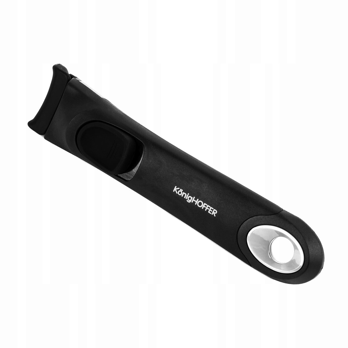 Съемная ручка Konighoffer Handy изготовлена из бакелита. Он имеет встроенный механизм, позволяющий легко прикреплять и отсоединять его от края кастрюли или кастрюли. Это возможно благодаря закреплению специально профилированного края сборных сосудов Handy. Он не повредит ни корпус, ни внутреннее антипригарное покрытие. Вы можете управлять им одной рукой. Ручка поможет вам заменить поврежденную ручку или будет лежать на вашей кухне в качестве запасной. Модель оригинальная и посвящена серии Handy. Он надежно лежит в руке и имеет отверстие для подвешивания кастрюли или сковороды. Вы можете прикрепить его к любой точке края тела.