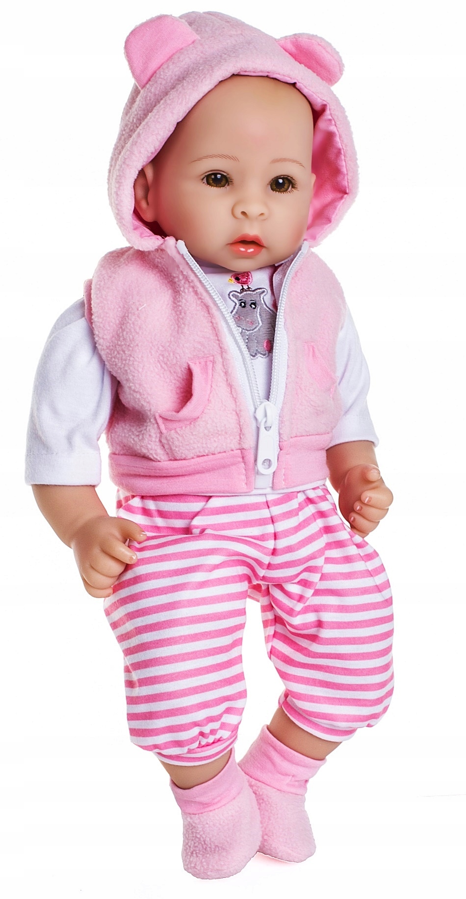 - Кукла Пола с веселым личиком выглядит как настоящий ребенок. Реалистичная копия настоящей милой малышки.