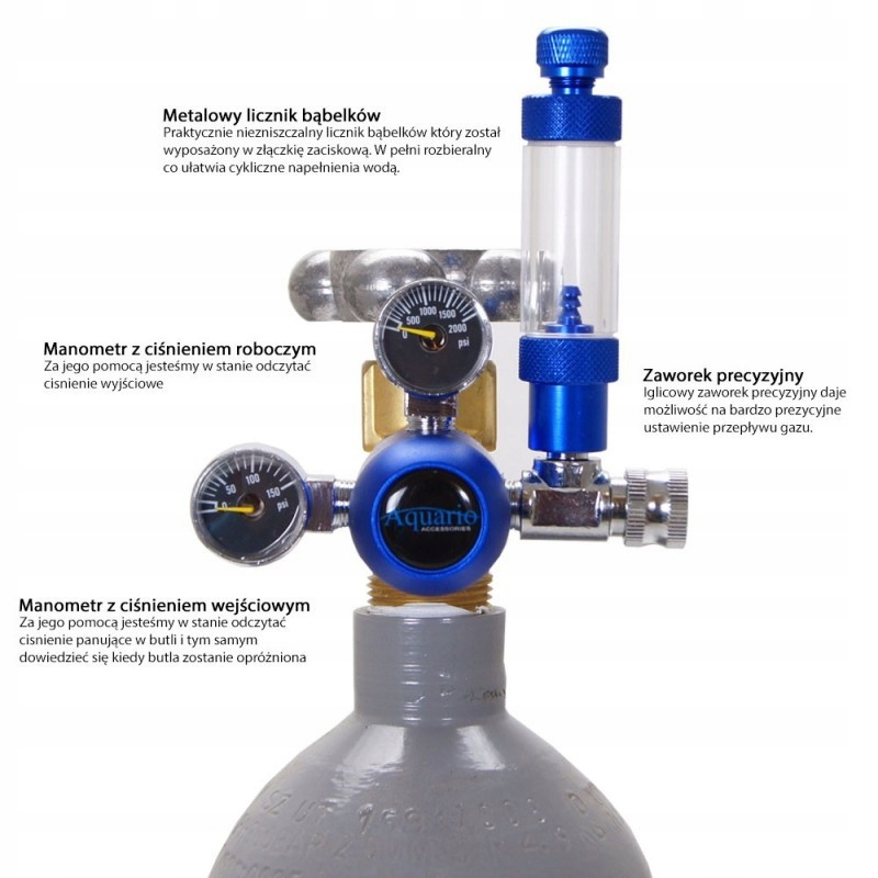 Редуктор Aquario Standard — это продукт высочайшего качества, полностью созданный специально для нужд аквариумов. Он отличается исключительной точностью дозирования CO2 и конструкцией, в которой используются проверенные на практике решения. Редуктор имеет встроенный счетчик пузырьков, прецизионный клапан и обратный клапан. Двое часов показывают ключевые параметры системы CO2: давление внутри баллона и рабочее давление редуктора. Это позволяет легко прогнозировать расход газа в баллоне и считывать уровень снижения давления газа. Редуктор изготовлен из металлического сплава, отвечающего самым высоким техническим требованиям, гарантируя при этом высокую долговечность и надежность его компонентов. Благодаря этому прибор обеспечивает 100% герметичность и высокую точность дозирования газа.
