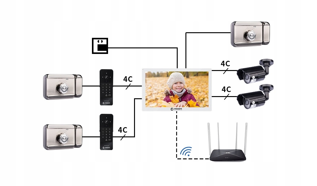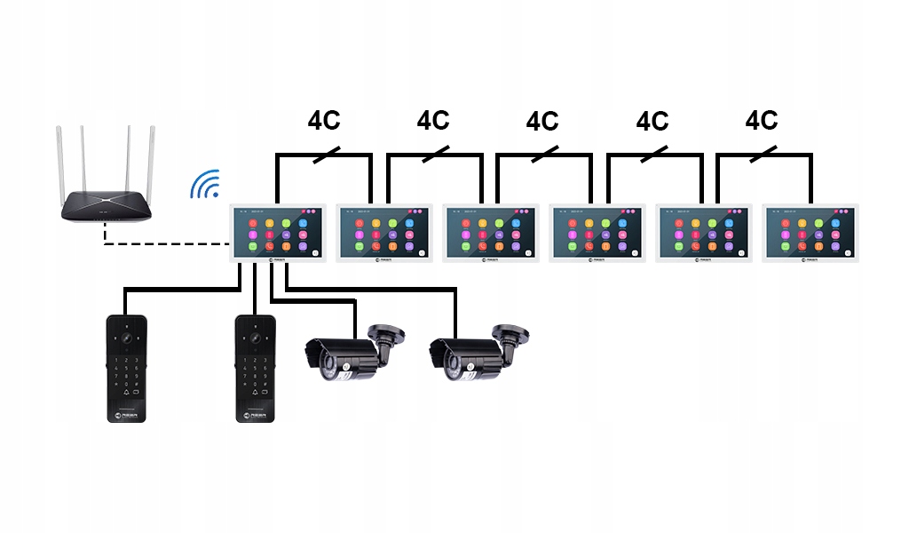 Комплект можно расширить максимум до 6 ЖК-дисплеев. панели и 2 внешние камеры со звонком (отдельные порты) и 2 камеры видеонаблюдения для дополнительного наблюдения за территорией.