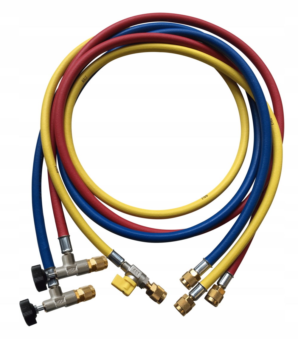 набор из 3 шлангов длиной 150 см. Синий, красный и желтый, прямое соединение. , (1/4 "SAE), чтобы облегчить заполнение и опустошить систему. Желтый шланг 1/4" SAE имеет шаровой клапан.