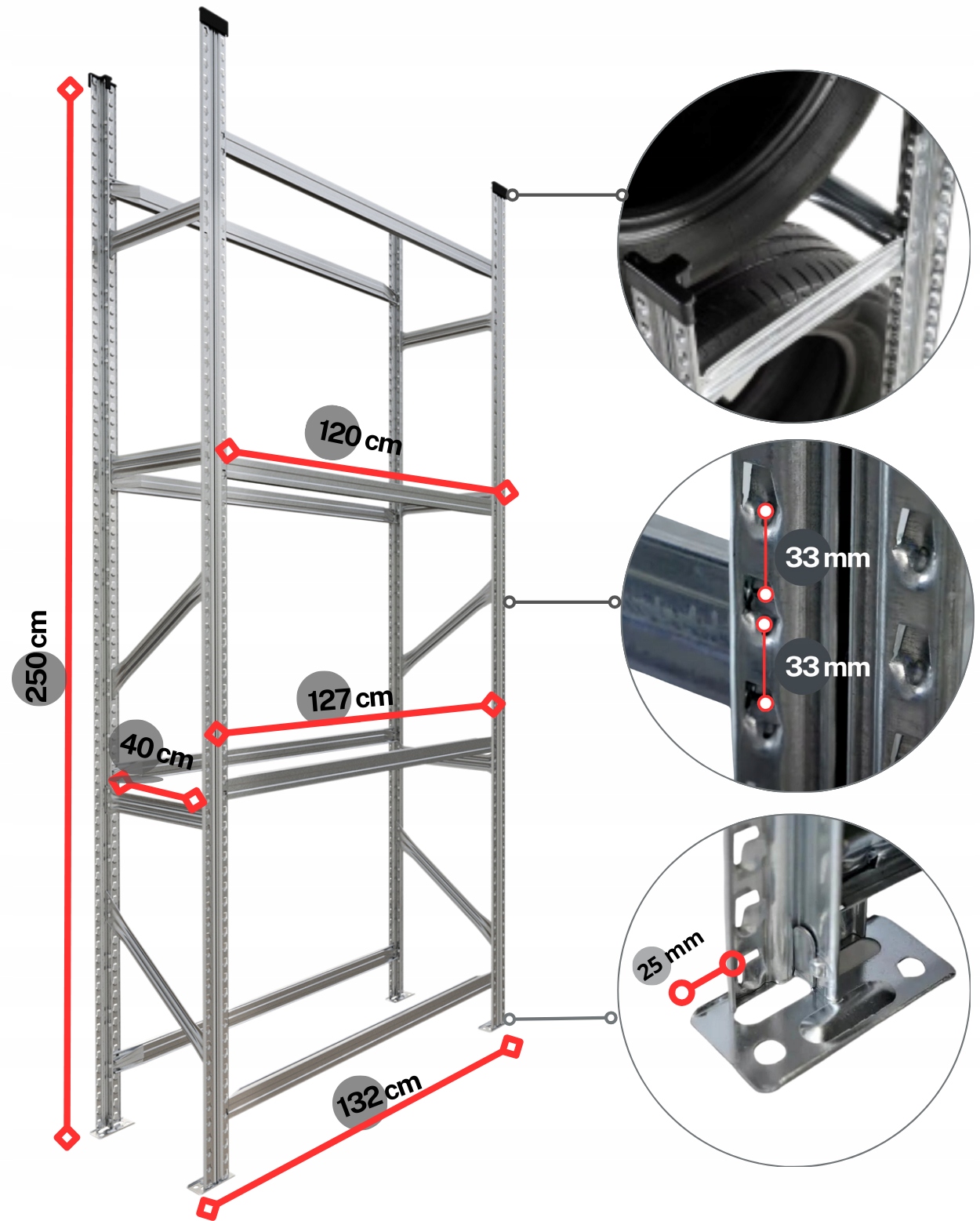 Шаг перфорации каждые 33 мм, что означает, что вы можете самостоятельно определить положение балок – уровень хранения, в зависимости от предпочтений пользователя, при этом максимальное расстояние между уровнями составляет 70 см.