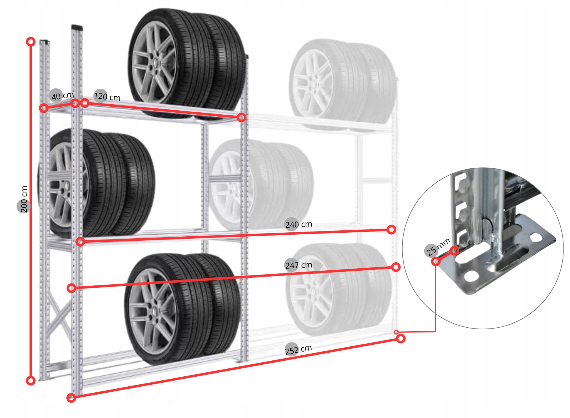 Функциональный и прочный стеллаж для хранения шин или колес для профессиональных мастерских, сервисных центров, складов шин, шиномонтажных предприятий, а также домашних гаражей и подвалов.