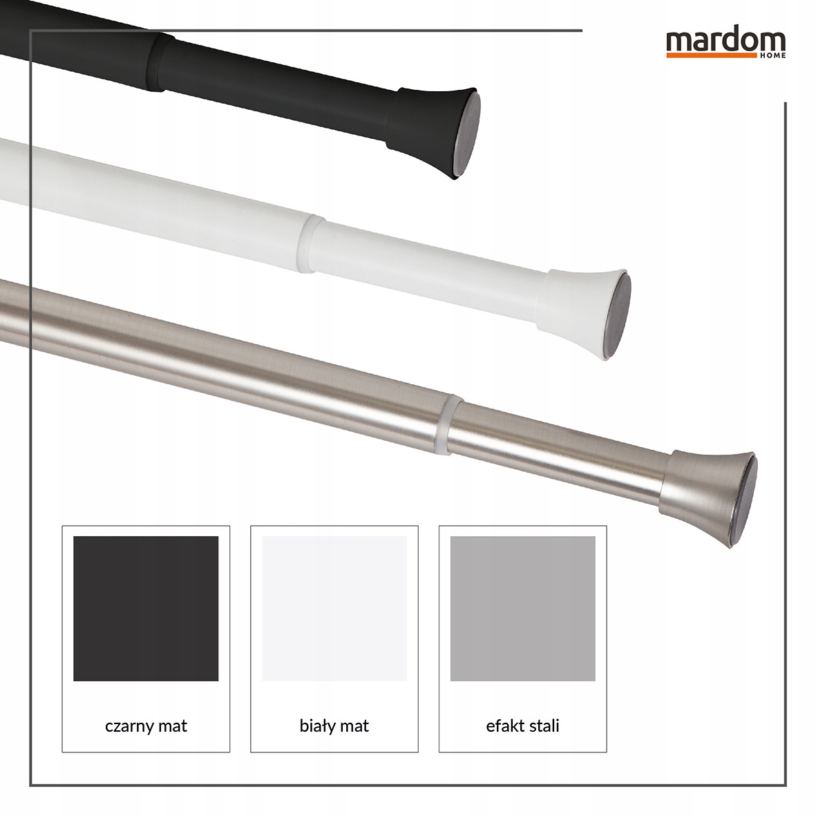 Штанга состоит из двух цельных металлических трубок диаметром 26 и 22 мм и подпружиненного механизма. Благодаря телескопической регулировке вы сможете отрегулировать его до нужной длины. Для сборки не нужны никакие инструменты, и ее можно сделать быстро. Просто открутите стержни, установите ширину и поместите в нужное место. Это чрезвычайно универсальное решение, которое хорошо подойдет для гостиной, кухни, ванной комнаты, гардеробной или кладовой. Установив его вместе с тканью, можно закрыть окна, создать ширму над проходом или нишей. Вы можете эстетично замаскировать место хранения вещей, которые хотите оставить незаметными. На него можно повесить декоративные элементы. Вы можете использовать его как вешалку для одежды или полку в шкафу. Он также пригодится, например, для хранения инструментов в гараже или аксессуаров на кухне, а также позволит создать душевую перегородку в ванной комнате.