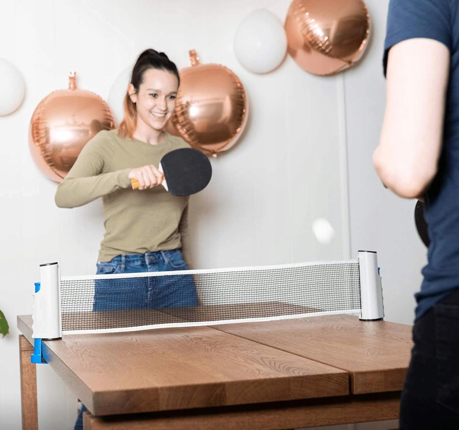Портативная сетка для пинг-понга инновационного дизайна, позволяющая крепить ее к столам шириной до 170 см и толщиной до 5 см. Более того, его просто установить, а настройка займет всего несколько минут. Крепление устойчиво благодаря противоскользящему покрытию, что обеспечивает комфорт во время использования и доставляет удовольствие. Благодаря специальным пружинам, после установки сетка всегда находится под натяжением, что превращает игру в удовольствие, а также ее можно легко раскладывать и складывать с помощью автоматических роликов.