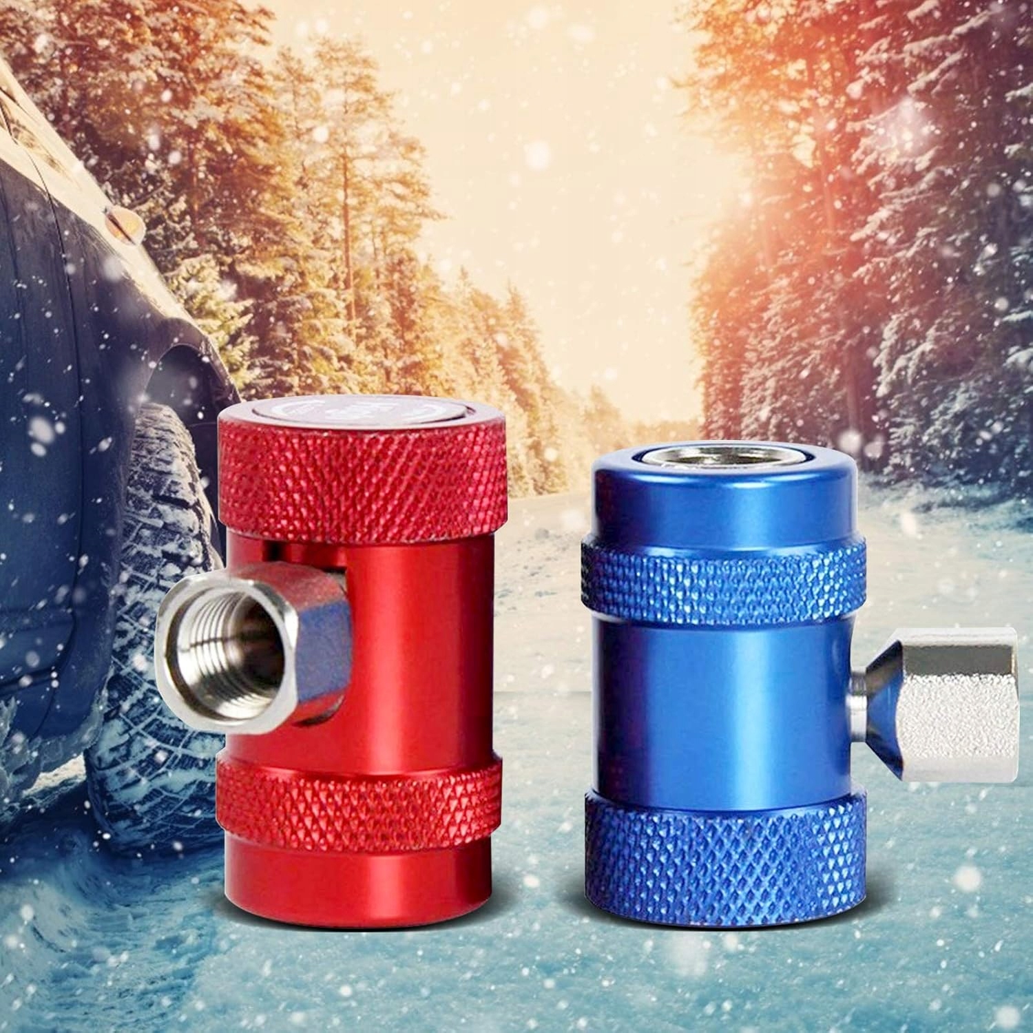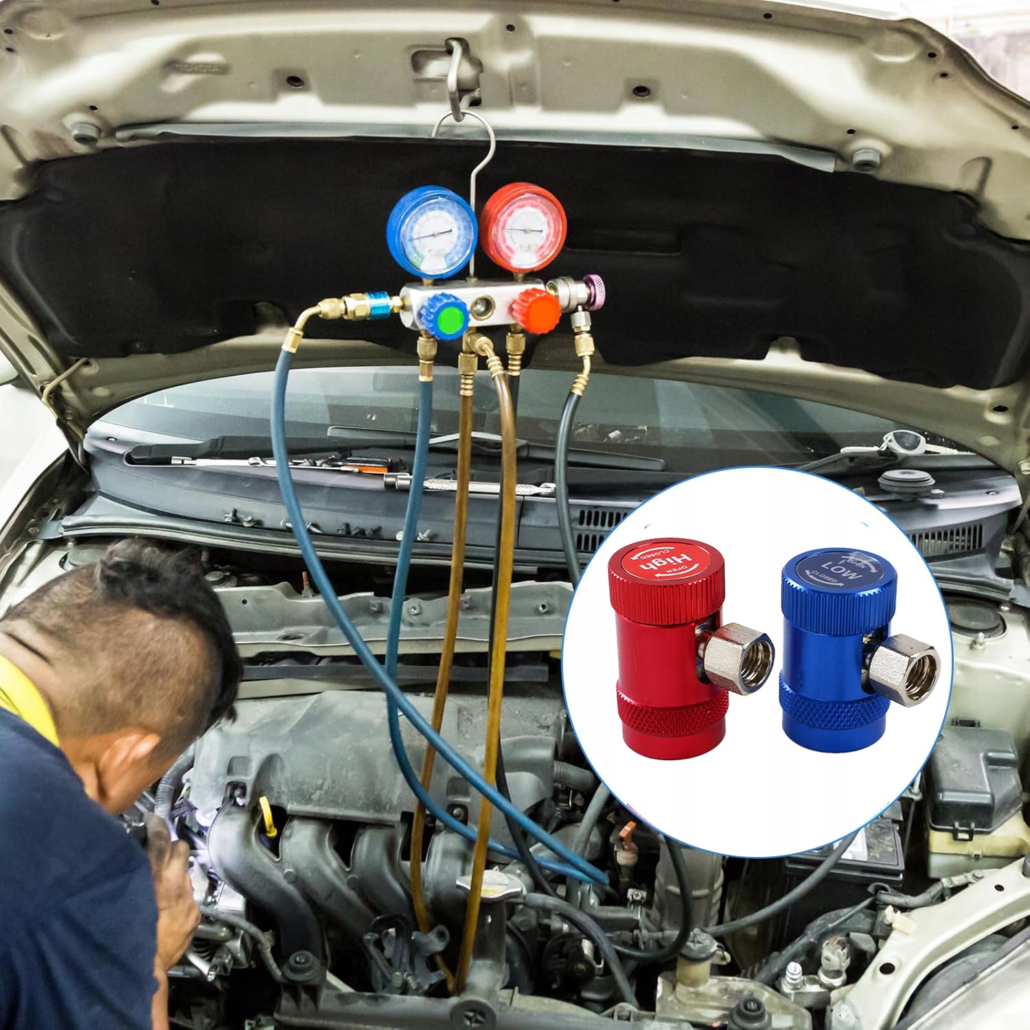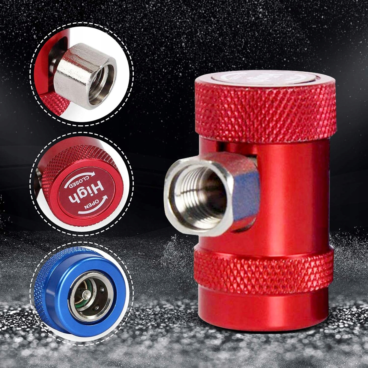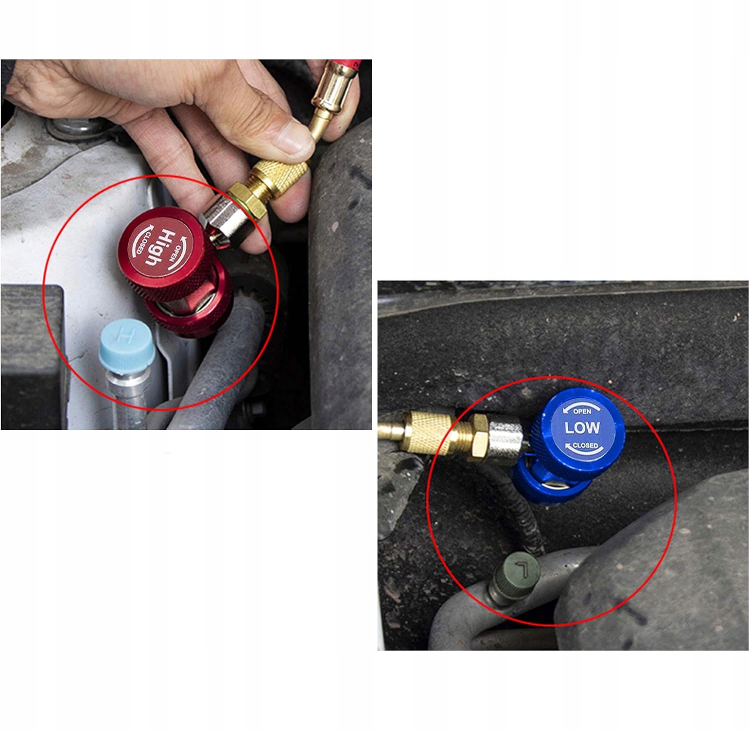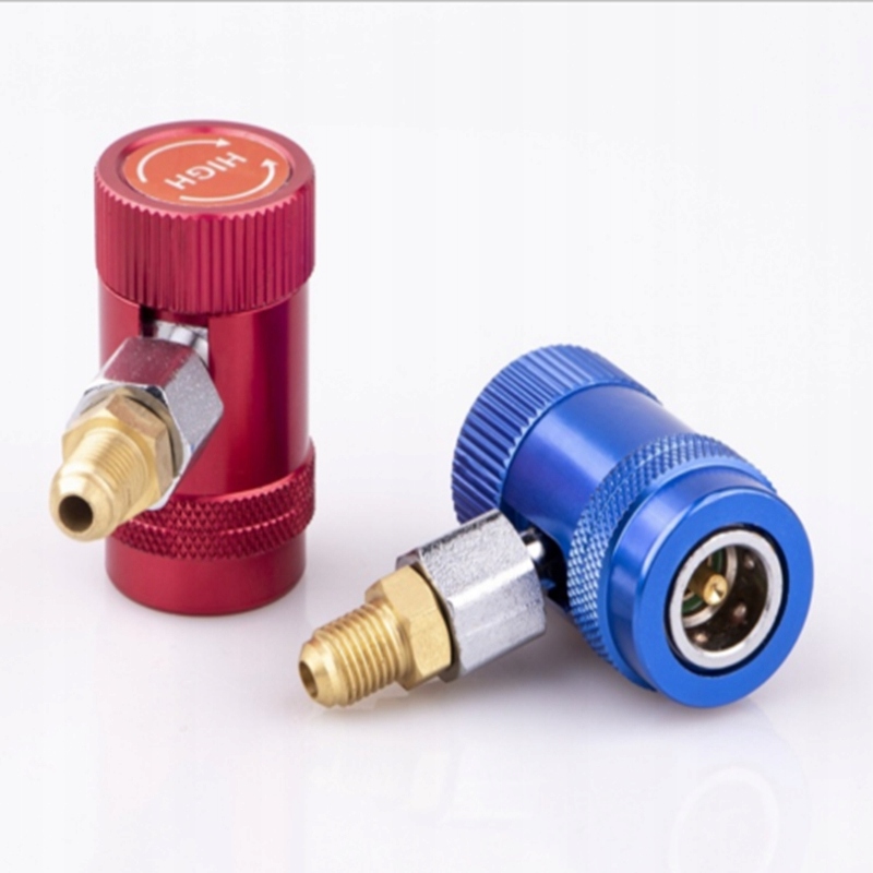 Адаптеры высоких и низких быстрых муфт подходят для хладагентов R1234YF, индикатора коллекционера переменного тока, диагностического контроля, восстановления и опорожнения. Установка, красный для высокого давления, синий для низкого давления, содержит 2 части съемного латунного адаптера.
