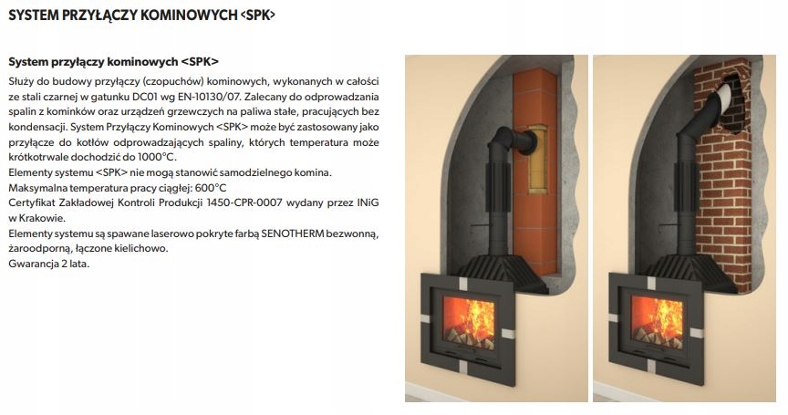 Соединения дымохода выполнены из листовой стали черного цвета марки DC01 толщиной 2,0 [мм]. Применяются в качестве соединений для отвода выхлопных газов каминов и твердотопливных отопительных приборов (работающих без конденсации), где температура выхлопных газов может достигать 1000 [ºC].