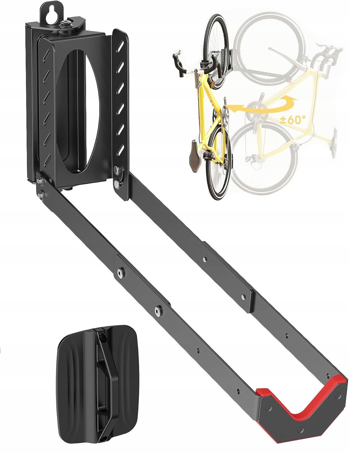Гибкая функция наклона: диапазон поворота от +60° до -60°, кронштейн-держатель позволяет идеально расположить велосипед, оптимизируя пространство для хранения и обеспечивая различные пространственные конфигурации.