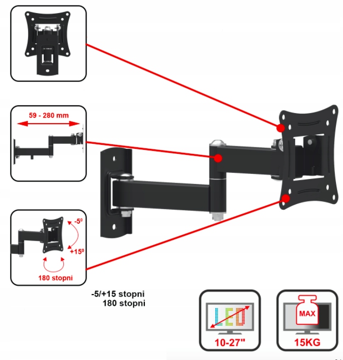 Настенный подвижный РУЧКА для плазменных ЖК-телевизоров размером 10–32 дюйма дюймы. Прочная БЕЗОПАСНАЯконструкция с большой настенной пластиной с возможностью регулировки наклона от - 5/+15°.