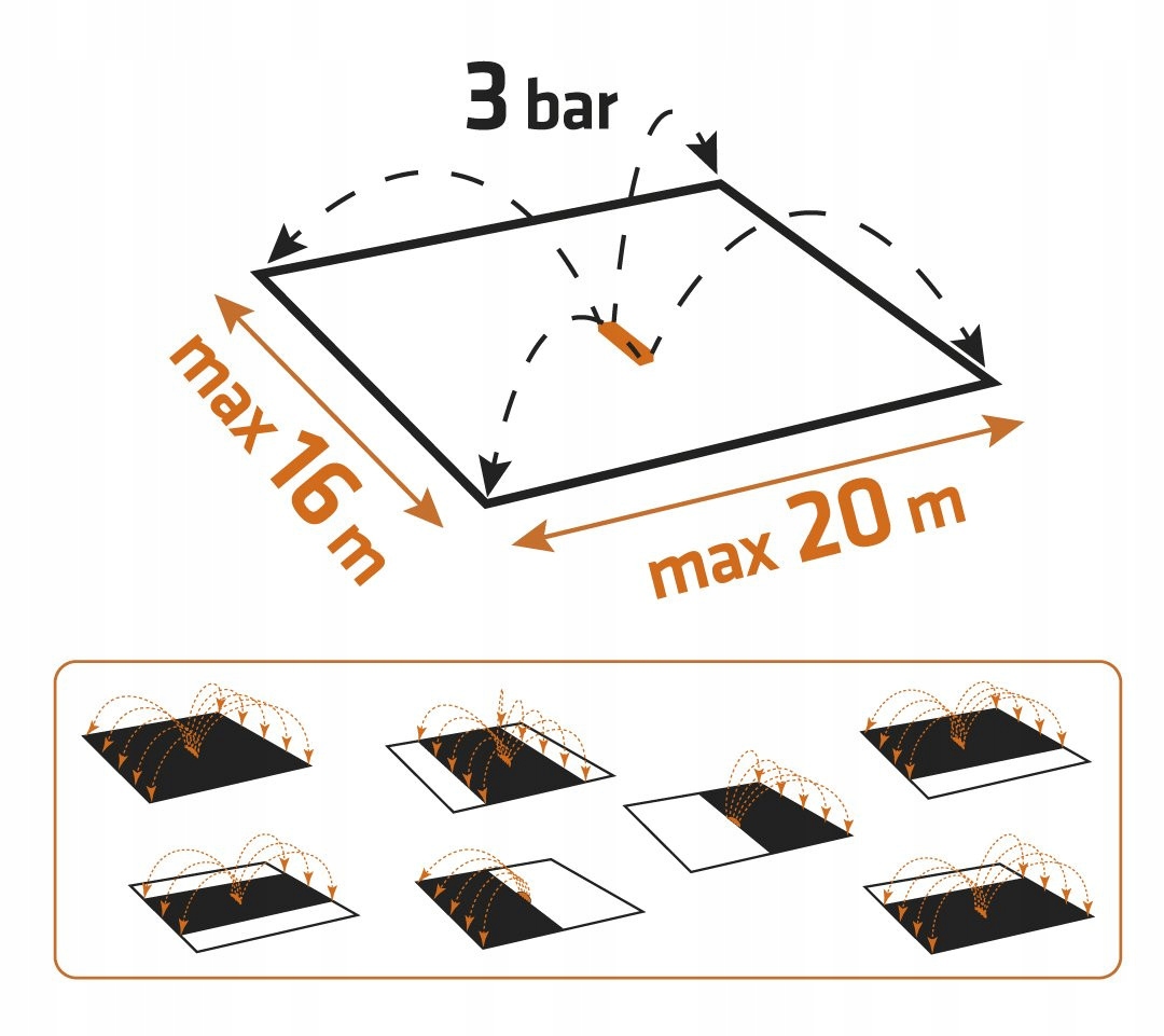 - Поливает территорию с максимальным размером 16 x 20 м, т.е. до 320 м2.