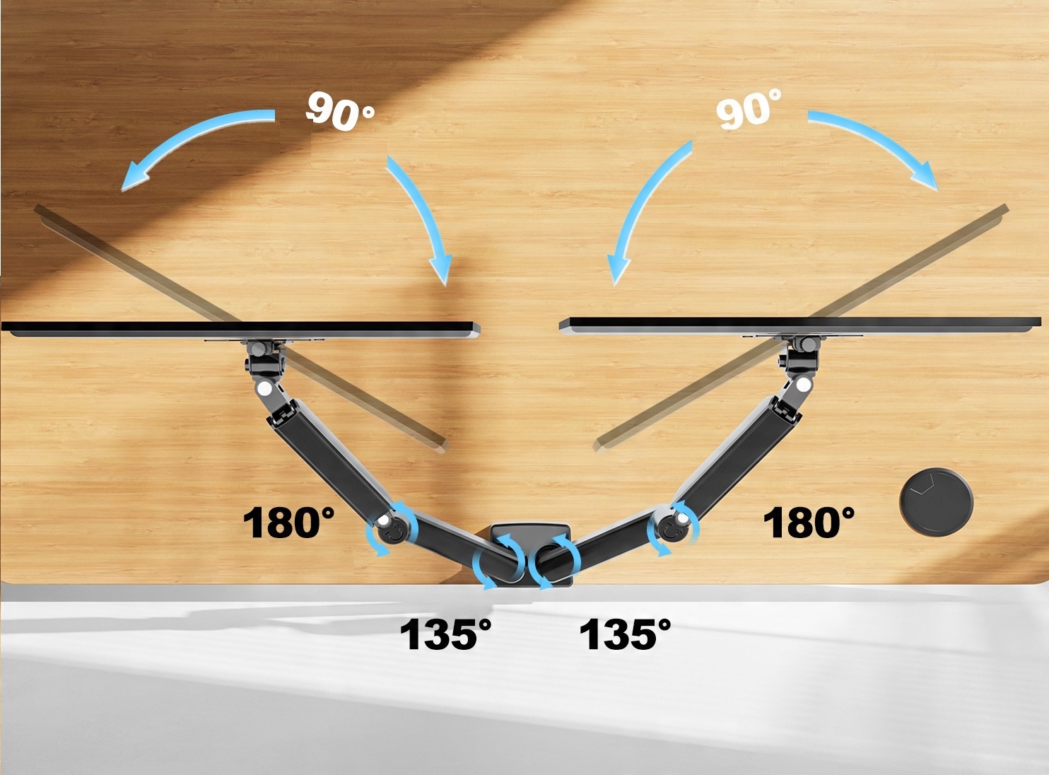 Высококачественный поворотный настольный держатель для двух ЖК-мониторов со светодиодной подсветкой с полной 3D-регулировкой и плавной регулировкой высоты на газовых пружинах.