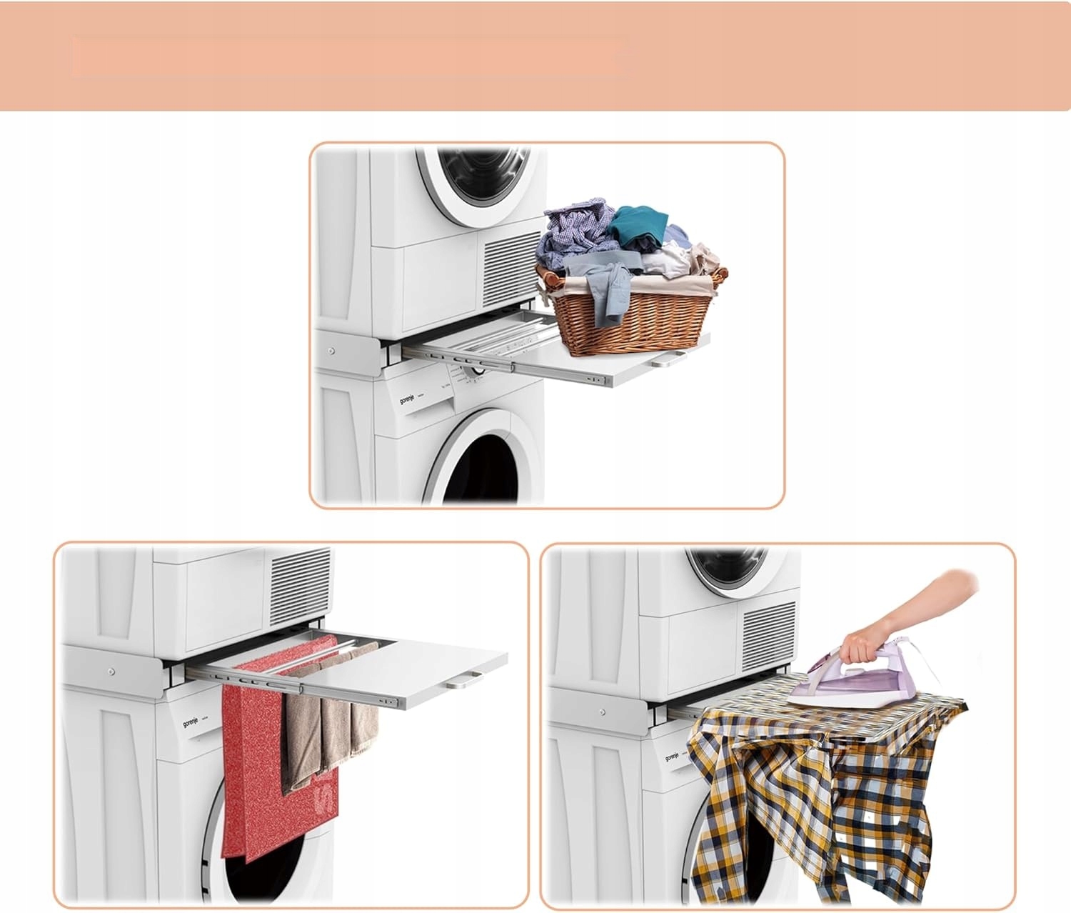 Набор стиральной машины состоит из полков для размещения корзин для прачечной или для складывания нижнего белья и вешалков для полотенец, чтобы повесить одежду/полотенца. Максимальная грузоподъемность: 20 кг.