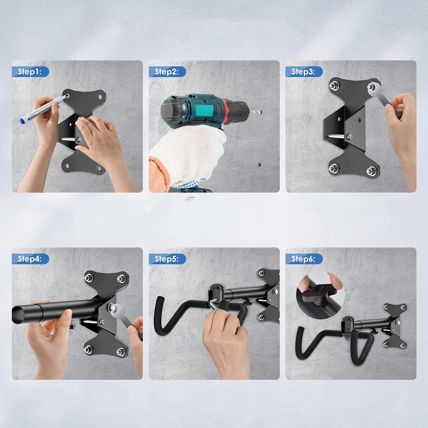 🚲【Простая установка】 требуется всего 2 винта. Рекомендуется для установки на устойчивых опорах, балках, кирпичных или бетонных стенах. Регулируемый угол на 360° и свободно регулируемая длина подходят для велосипедов различных форм и размеров. Не устанавливайте на самонесущие стены или гипсокартоны.