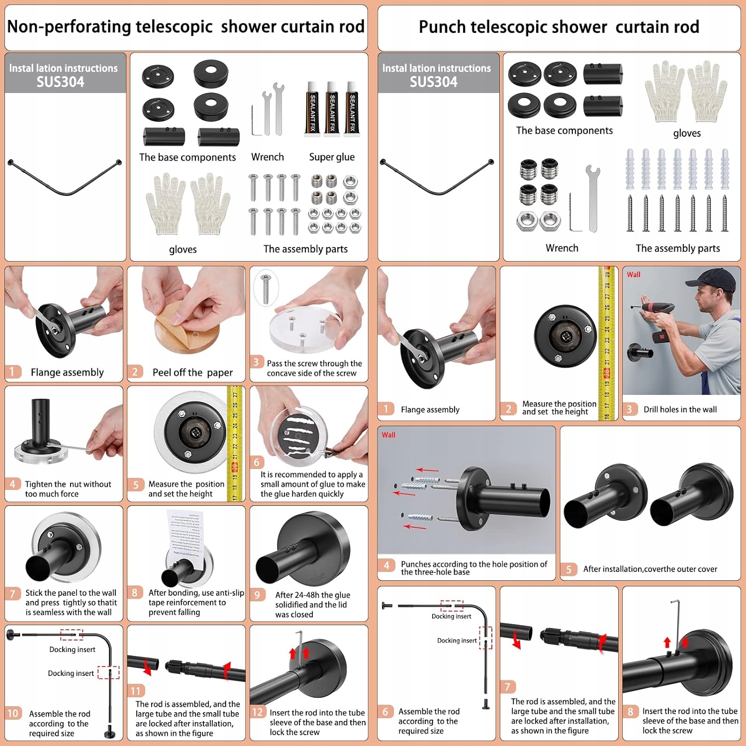 Этот стержень содержит 2 метода монтажа, сверкает отверстие или без бурения. Отсутствие бурения подходит только для гладких и плоских стен. Инновационный дизайн железной дороги, в котором занавеска для душа может свободно перемещаться вдоль бара, не нарушая поддержку потолка.