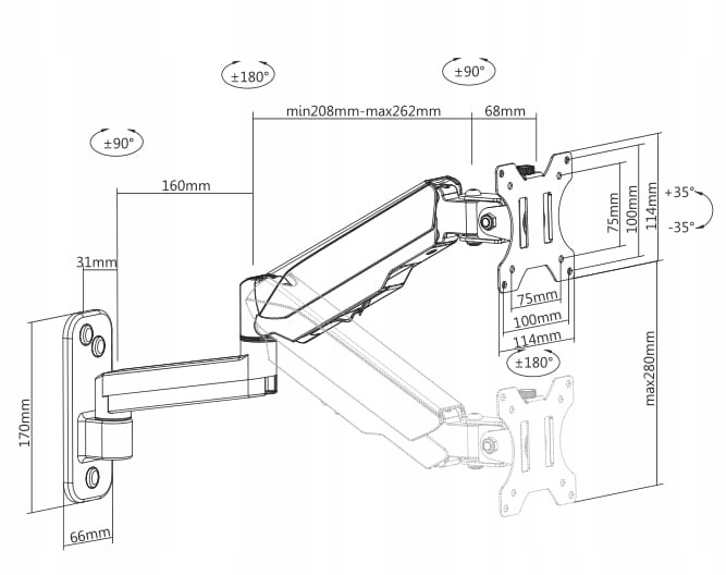 - Длинный двойной кронштейн длиной 8–53,5 см — позволяет широкий диапазон поворотов и настройка подходящего расстояния от стены и высоты телевизора/монитора.