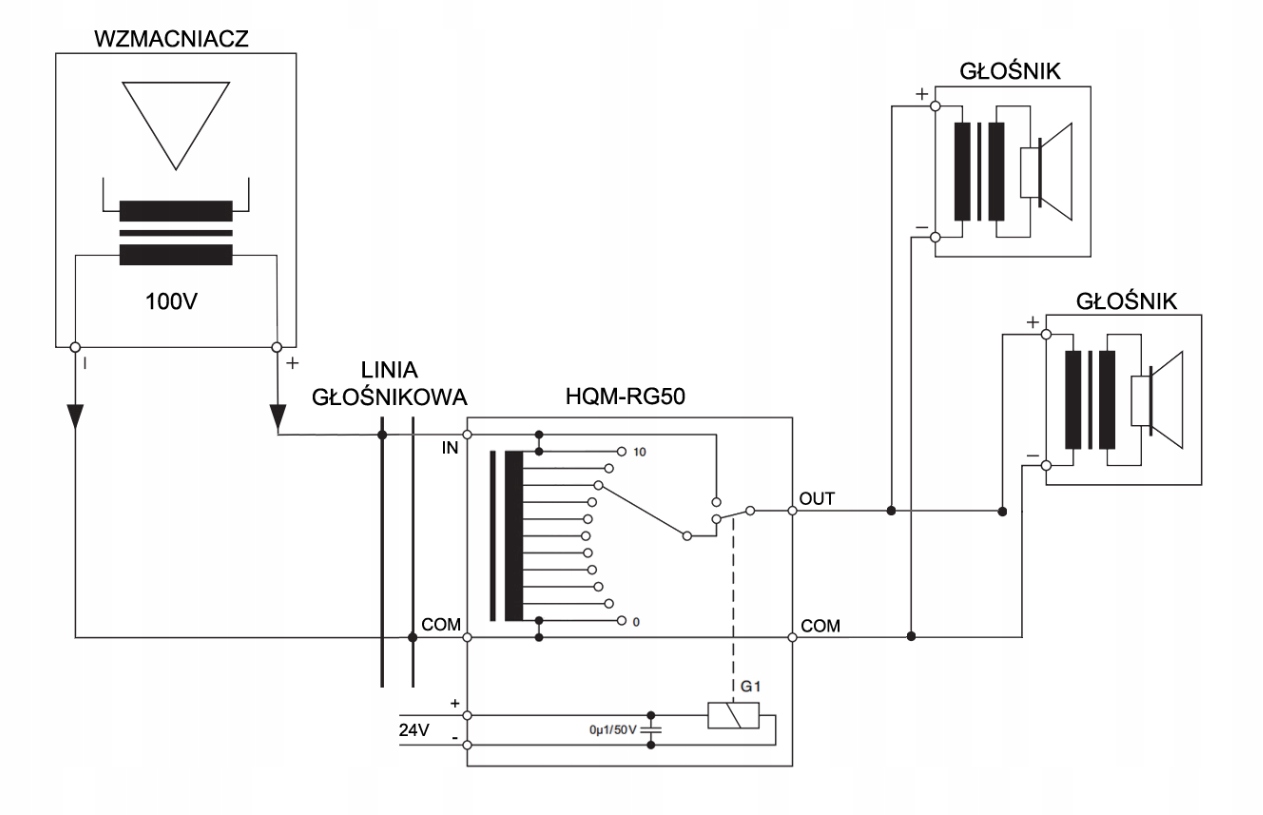Для еще лучшего функционирования в аудиосистемах регулятор громкости HQM VC12 оснащен обходным реле 24 В. Использование такого решения гарантирует трансляцию важных объявлений на полной громкости независимо от местных настроек. При подаче напряжения на вход реле цепь трансформатора размыкается и вся мощность от источника сигнала передается непосредственно на динамики. Это особенно важно в чрезвычайных ситуациях, например. если сторонний наблюдатель выключает громкоговоритель.