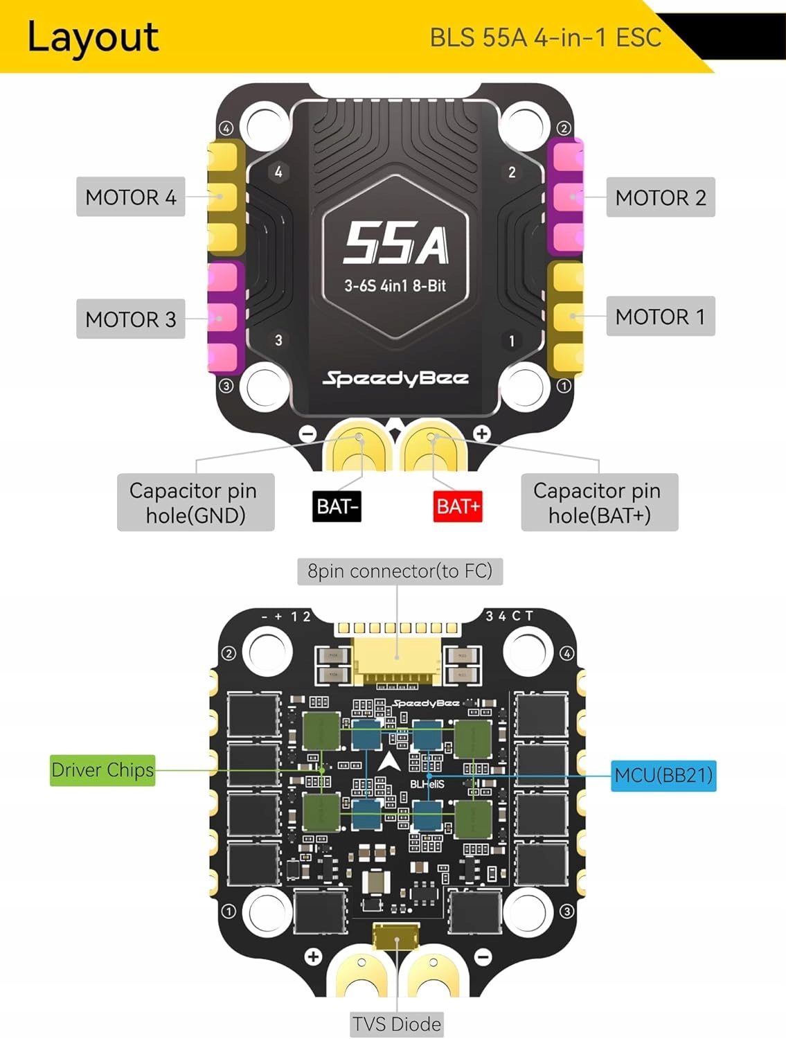 Эффективный контроллер ESC 4-в-1 на 55 А обеспечивает плавный и надежный полет благодаря прочной конструкции и японским фильтрующим конденсаторам. Идеально подходящий для интенсивного фристайла и гонок, он справится с любыми задачами благодаря самым мощным двигателям 6S.