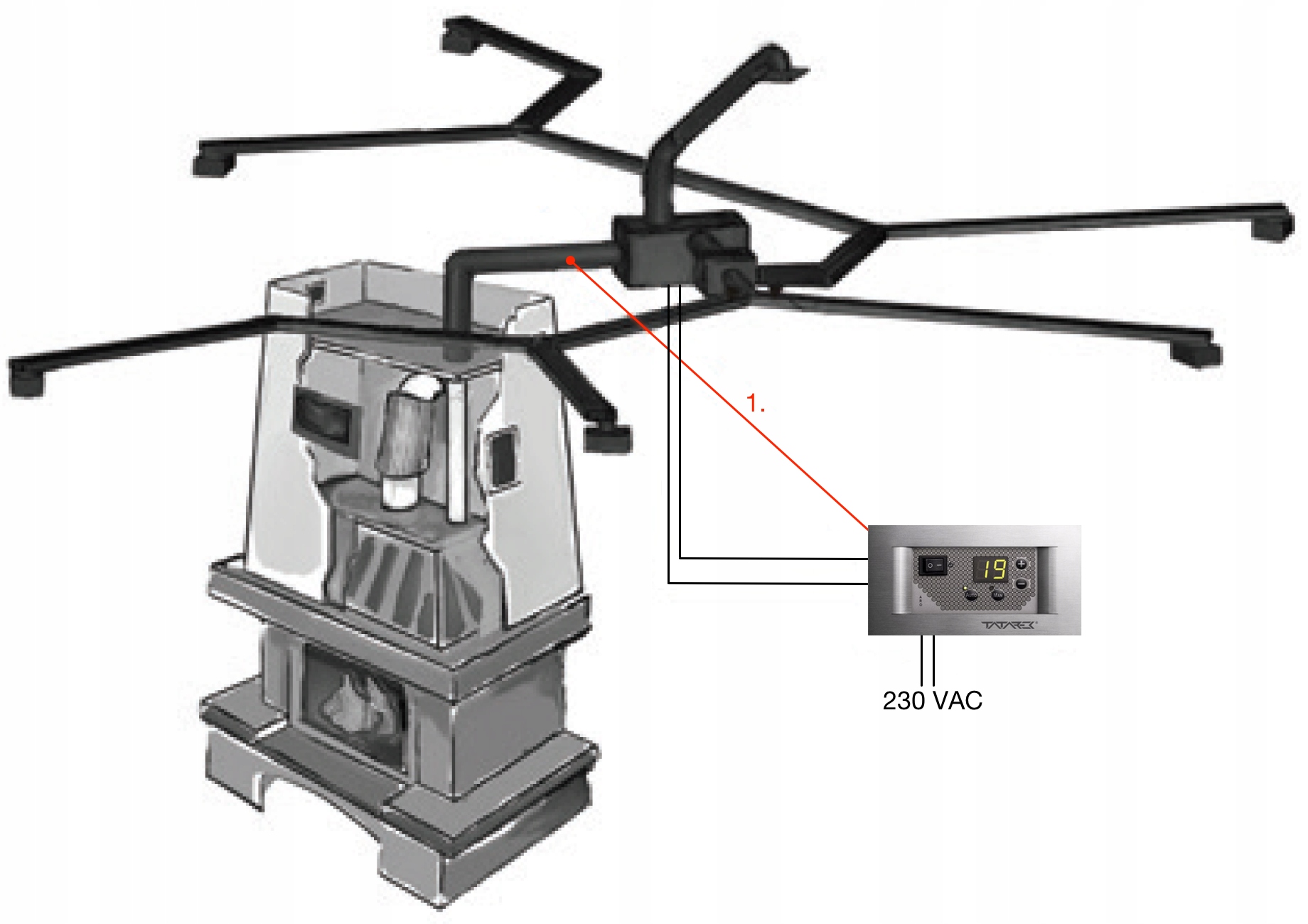 Лучшее место для его установки – на стене рядом с камином, рядом с электрической розеткой. Не размещайте регулятор в месте, где температура может превышать 40°C. Электропитание и двигатель вентилятора должны быть подключены в соответствии с электрической схемой, включенной в инструкцию по эксплуатации и монтажу, прилагаемую к контроллеру.Датчик температуры должен быть подключен следующим образом: красный (коричневый) провод, клемма «+», белая ( синий) провод, клемма "-".
