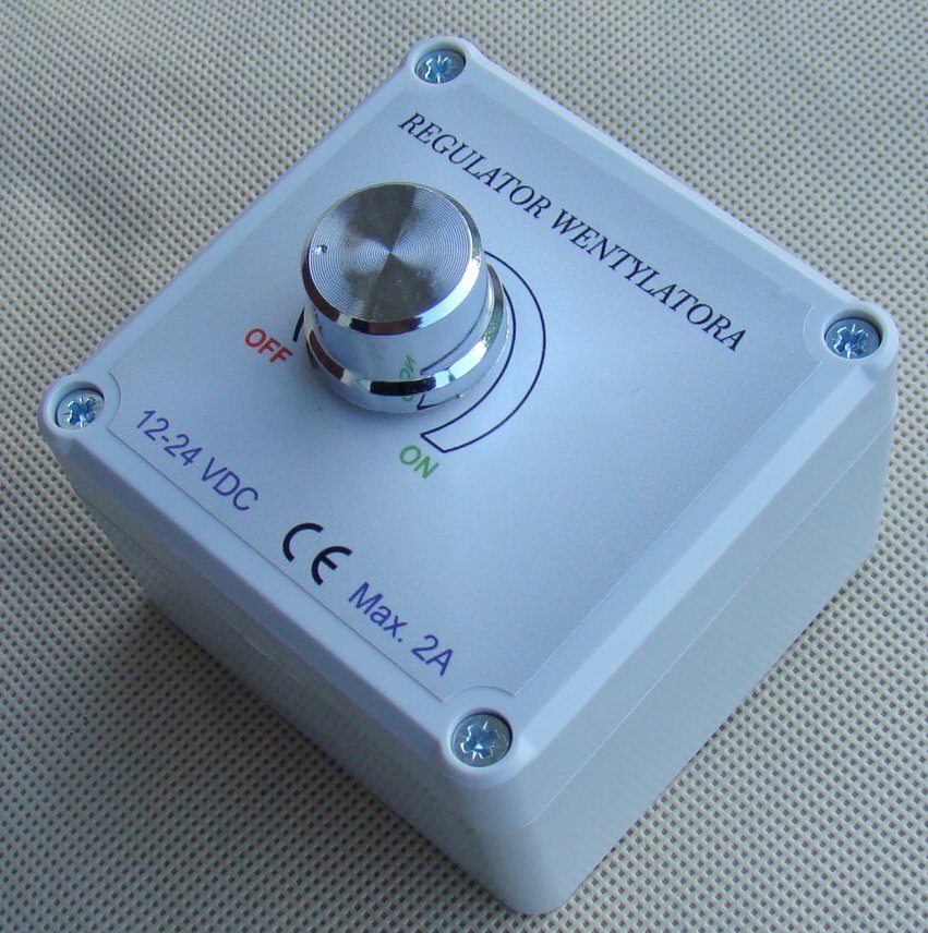 Регулятор используется для регулирования скорости вращения вентиляторов, питаемых напряжением 12–24 В постоянного тока. Регулятор не работает по принципу ШИМ-регулирования, поэтому работа этого регулятора не вызывает скрипа, гула вентилятора и т.п. эффектов, как в простых ШИМ-регуляторах. Этот регулятор работает за счет снижения напряжения питания, поэтому он также может регулировать вентиляторы, которые на заводе не адаптированы к типичному ШИМ-регулированию. Диапазон входного напряжения составляет от 10 до 30 В постоянного тока, а выходное напряжение от 2 до 24 В можно установить с помощью ручки. В случае вентилятора 12 В мы подаем питание от источника питания 12 В, а выходное напряжение можно установить примерно от 2 В до 12 В, тогда как в случае вентилятора 24 В мы подаем питание от источника питания 24 В и выход Напряжение можно установить от примерно 2 В до 24 В. Регулировка производится с помощью ручки регулятора, которая также оснащена выключателем питания. Максимальная нагрузка регулятора постоянная 1,5А и мгновенная 2А.