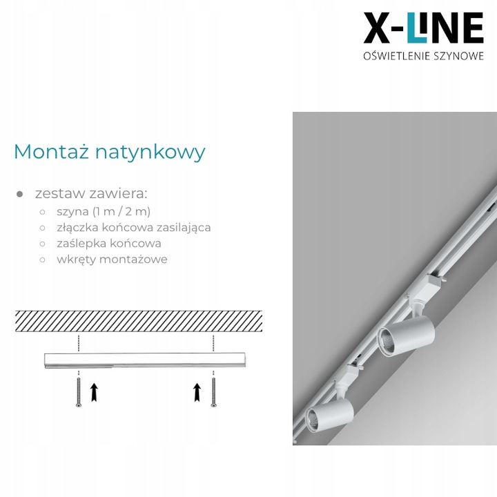 Основным продуктом трековой системы X-LINE являются треки длиной 1 м. или 2 м, доступны в белом или черном цвете. Каждая направляющая включает в себя разъем питания, позволяющий подключаться непосредственно к сети 230 В переменного тока, и торцевую заглушку.