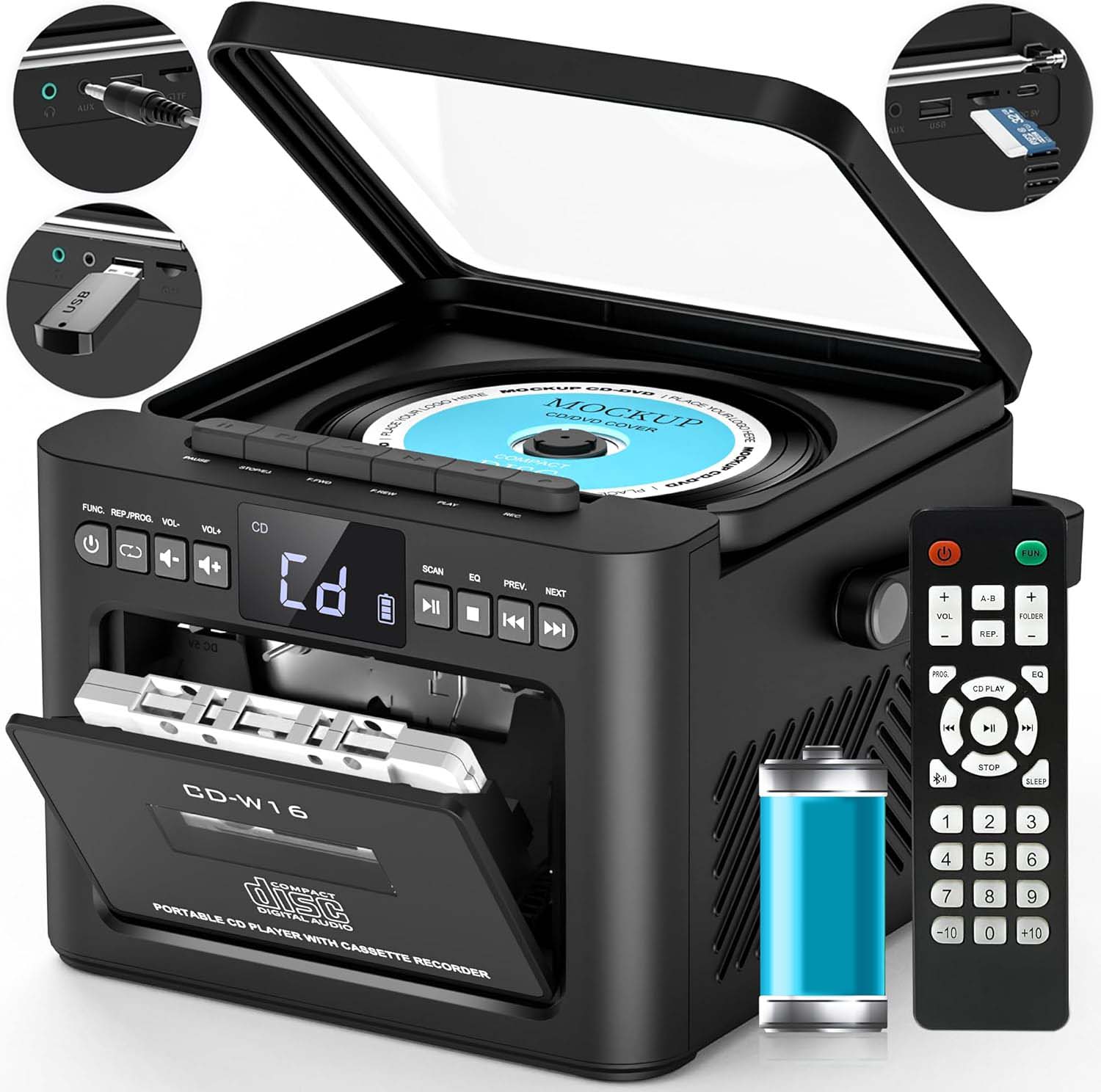 ✅ ✅ПОРТАТИВНЫЙ CD-ПЛЕЕР, КАССЕТНЫЙ МАГНИТОФОН БУМБОКС С FM-РАДИО, BLUETOOTH 5.1, ВХОД ДЛЯ КАРТЫ AUX/USB/SD, АККУМУЛЯТОР НА 5000 МАЧ, ПУЛЬТ ДИСТАНЦИОННОГО УПРАВЛЕНИЯ И СВЕТОДИОД (ЧЕРНЫЙ) ✅✅