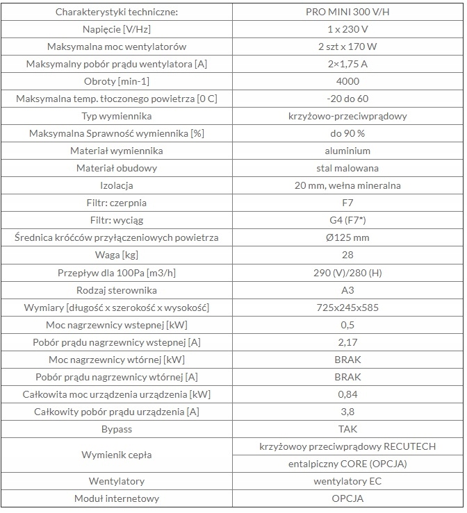 В список входит Рекуператор PRO MINI 300В (параметры и технические данные ниже)